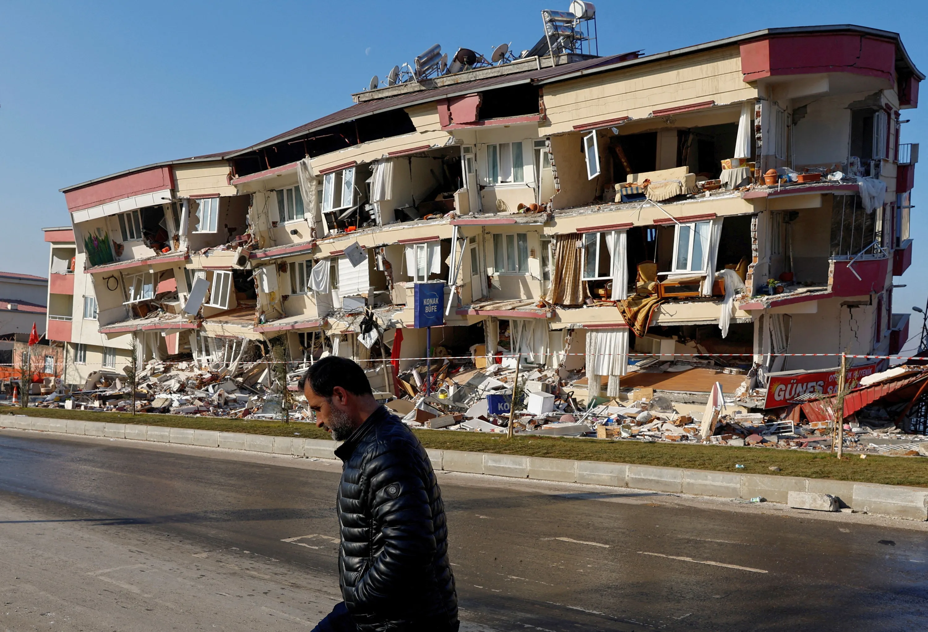 A man walks past a damaged building in the aftermath of a deadly earthquake in Kahramanmaras, Turkey on February 13, 2023. (Photo by Suhaib Salem/Reuters)