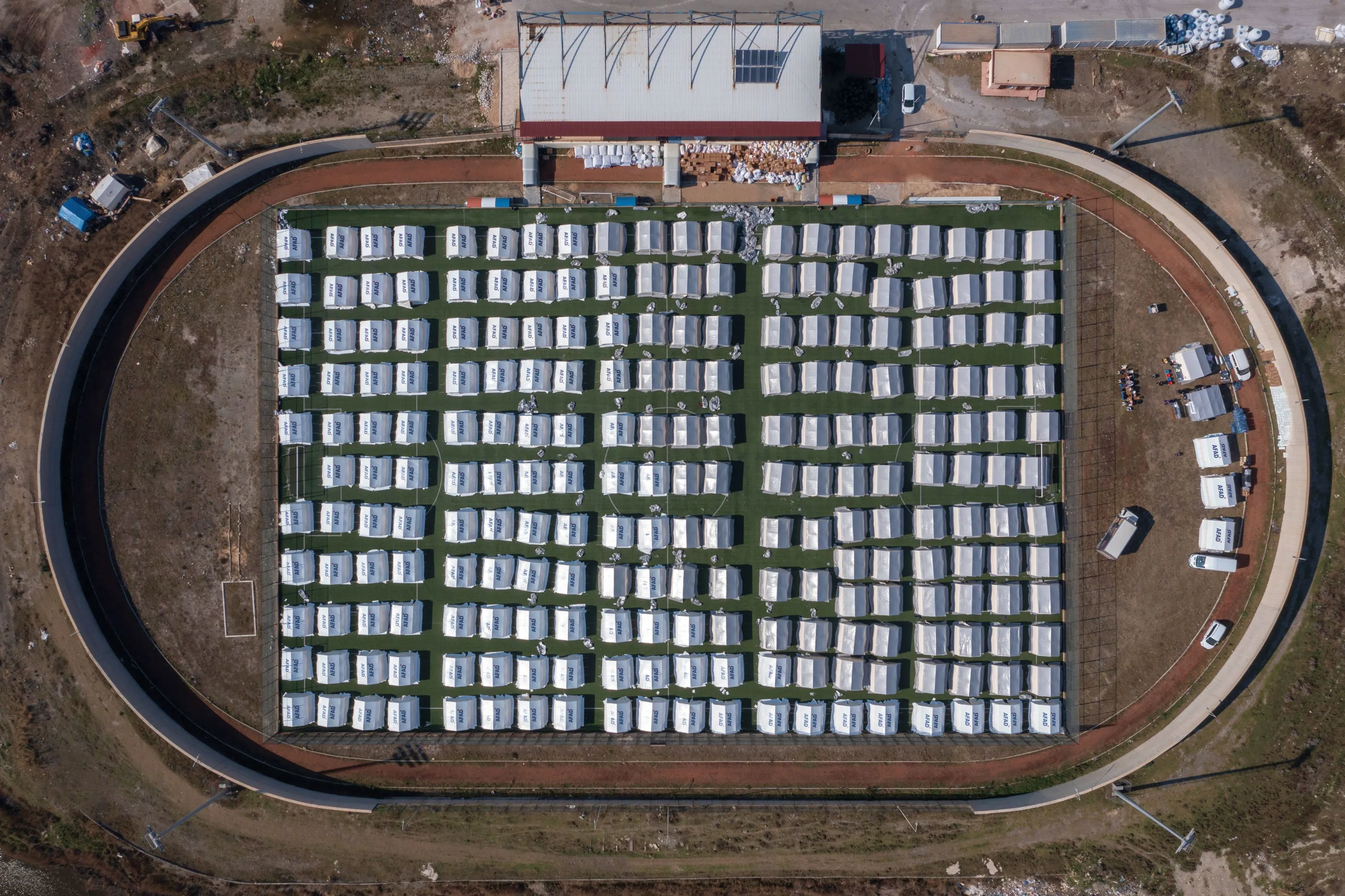 Tents stand at an internal displacement camp at the Samandag Stadium in the aftermath of a deadly earthquake on February 13, 2023 in Samandag, Turkey. A 7.8-magnitude earthquake hit near Gaziantep, Turkey, in the early hours of Monday, followed by another 7.5-magnitude tremor just after midday. The quakes caused widespread destruction in southern Turkey and northern Syria and have killed more than 30,000 people. (Photo by Burak Kara/Getty Images)