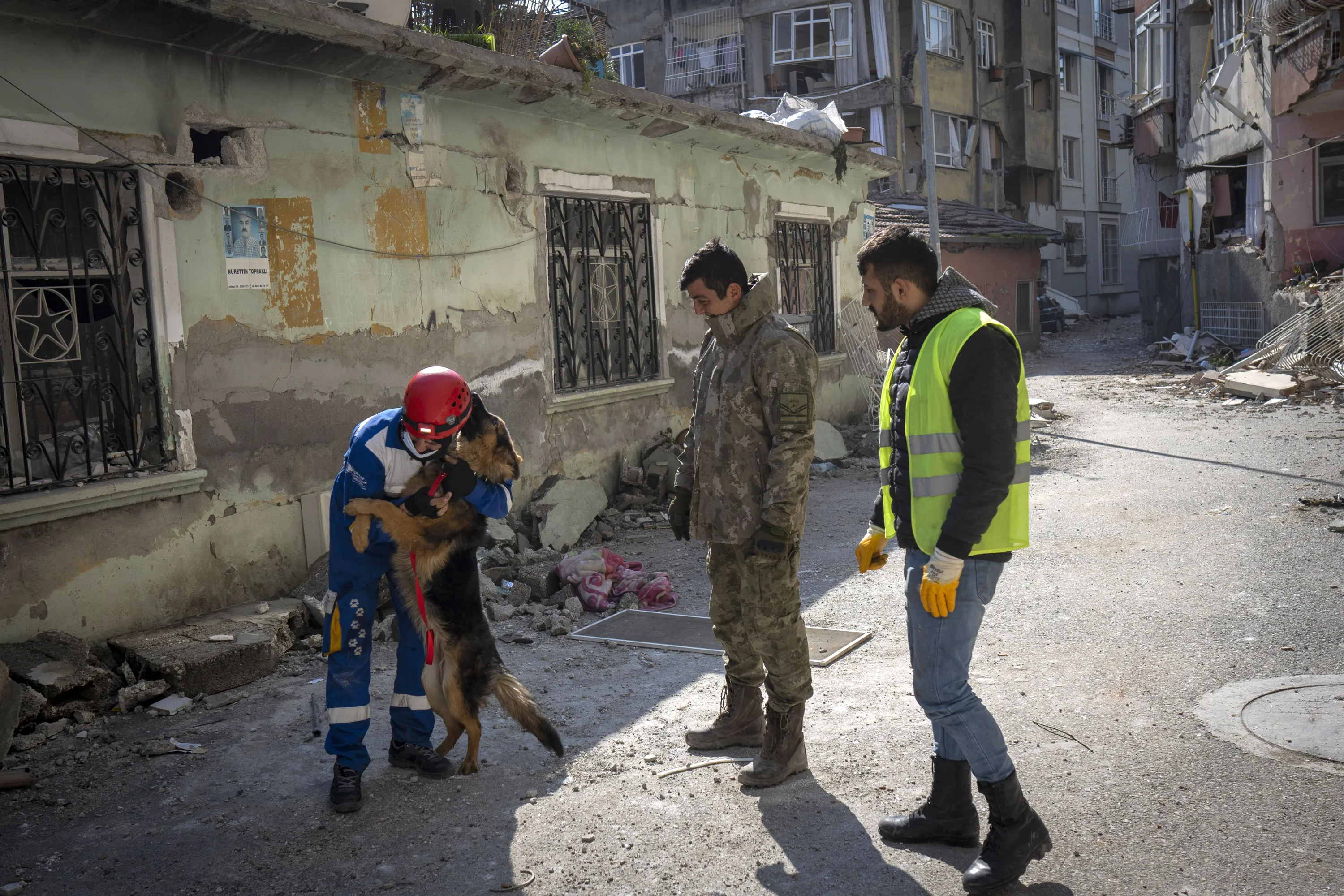 Mehmet Gurkan, a member of the Turkish animal rights group HAYTAP, pets a dog after rescuing it from a building affected by the earthquake in Antakya, southeastern Turkey, on Sunday, February 12, 2023. The German shepherd was rescued after being trapped for seven days inside the building. (Photo by Bernat Armangue/AP Photo)