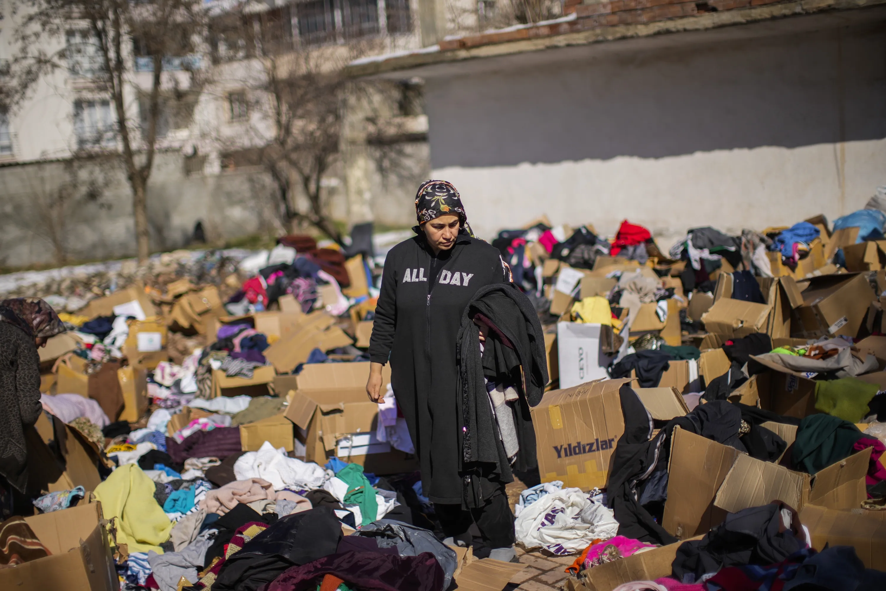 A woman who survived the earthquake checks out donated clothes in Golbasi, Turkey, Monday, February 13, 2023. Thousands left homeless by a massive earthquake that struck Turkey and Syria a week ago packed into crowded tents or lined up in the streets for hot meals Monday, while the desperate search for anyone still alive likely entered its last hours. (Photo by Francisco Seco/AP Photo)