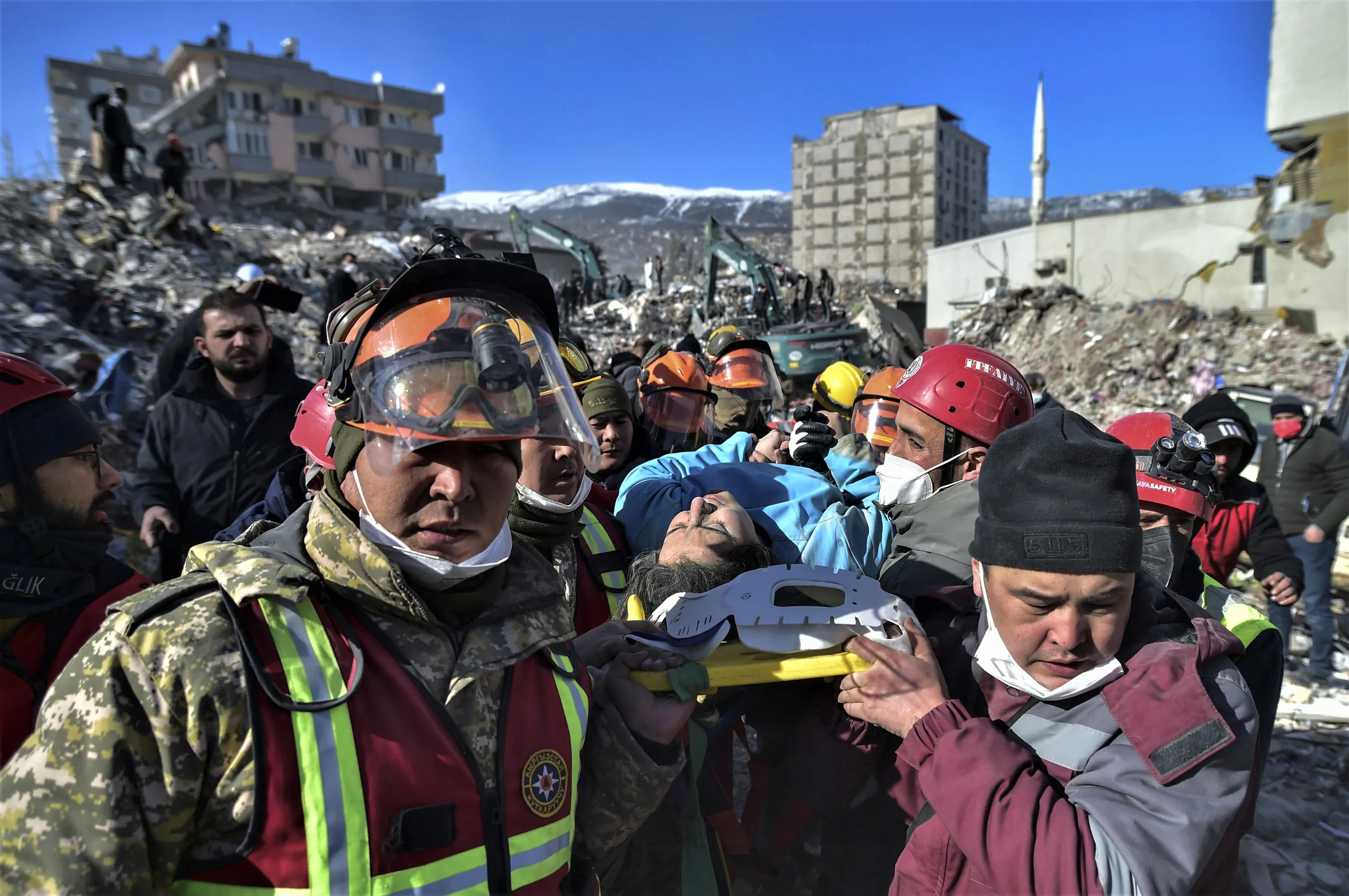 Turkish rescue workers from Kazakhstan and Turkey pull out Hatice Akar from a collapsed building 180 hours after the earthquake in Kahramanmaras, southern Turkey, early Monday, February 13, 2023. (Photo by IHA via AP Photo)