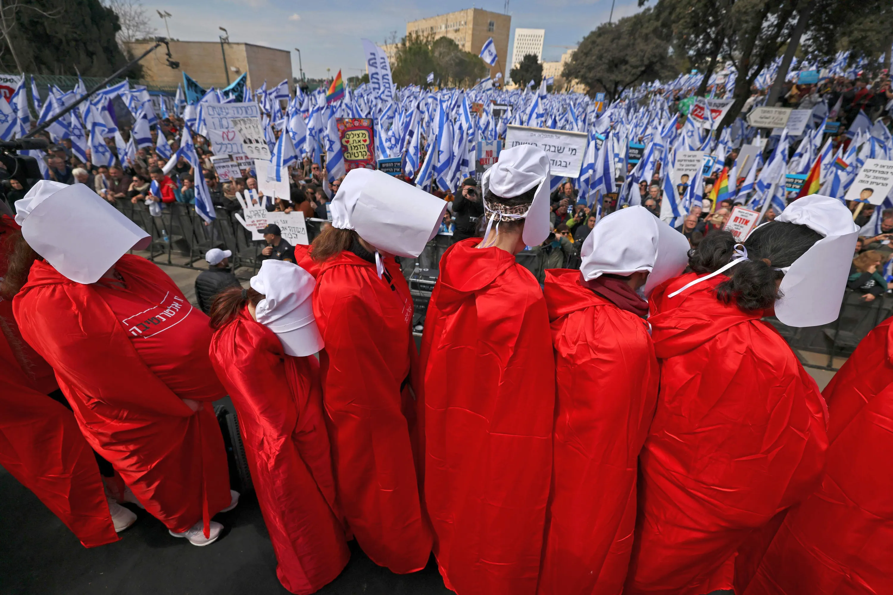Israeli protesters wearing 'Handmaid's Tale' costumes attend a rally outside the Knesset (parliament) in Jerusalem on February 13, 2023, against controversial legal reforms being touted by the country's hard-right government. (Photo by Ahmad Gharabli/AFP Photo)