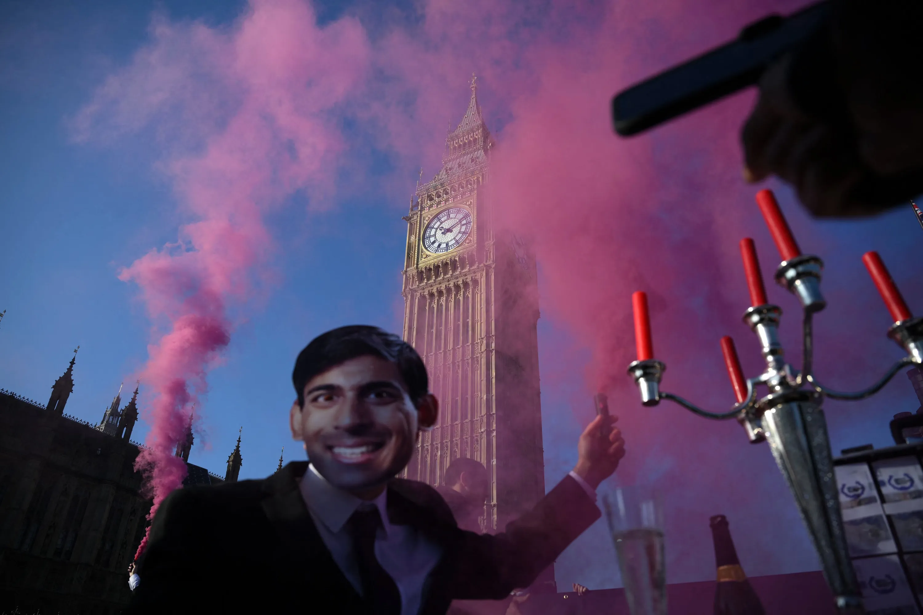 An activist wears a mask depicting Britain's Prime Minster Rishi Sunak during a protest by animal and climate justice group Animal Rebellion, blocking the road on Westminster Bridge in central London, on February 14, 2023. (Photo by Daniel Leal/AFP Photo)