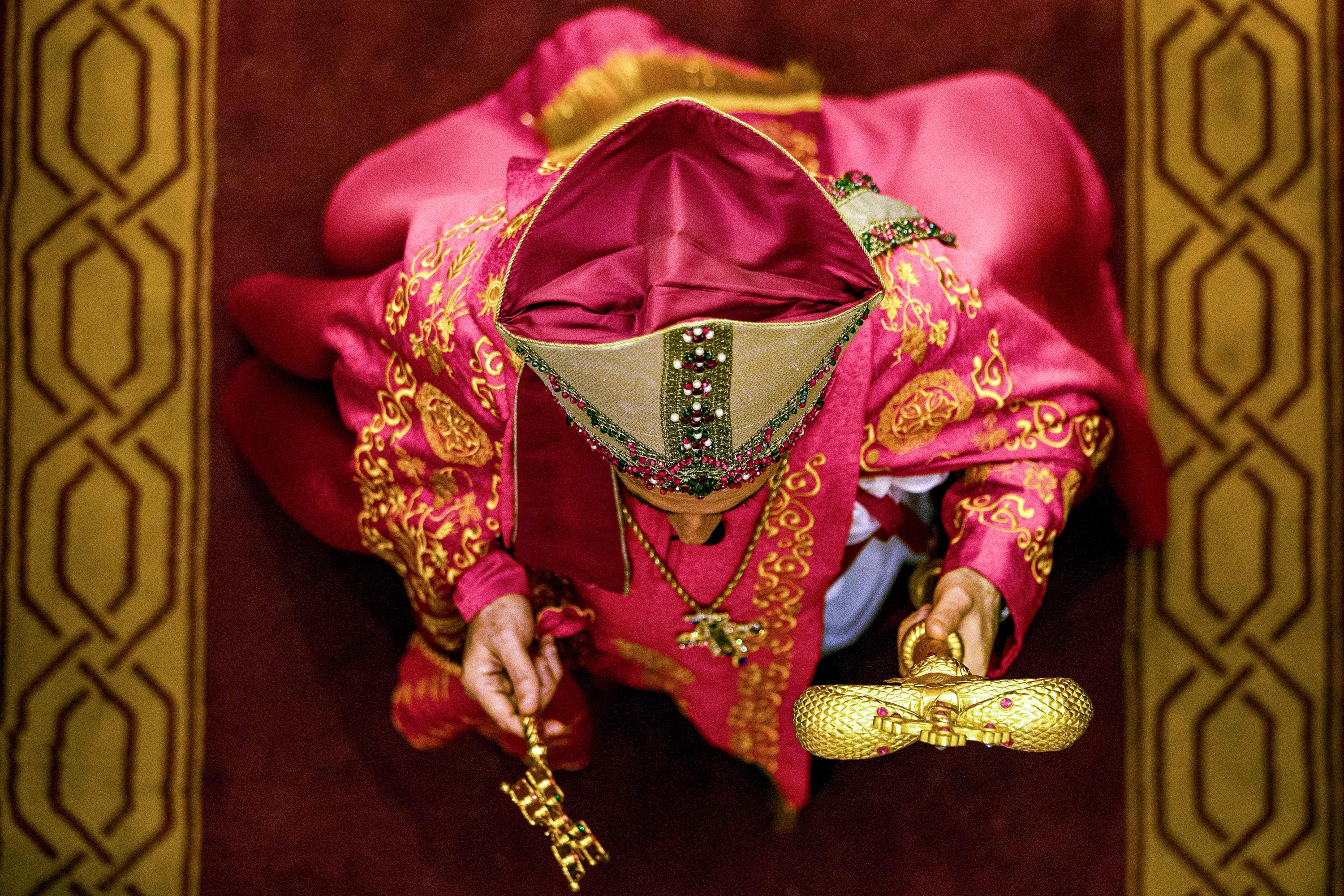Father Firas Dardar, patriarchal vicar for Basra and the Gulf, walks along the nave during the Christmas eve midnight mass at the Syriac Catholic Church of the Sacred Heart in Iraq's southern city of Basra on December 25, 2022. (Photo by Hussein Faleh/AFP Photo)