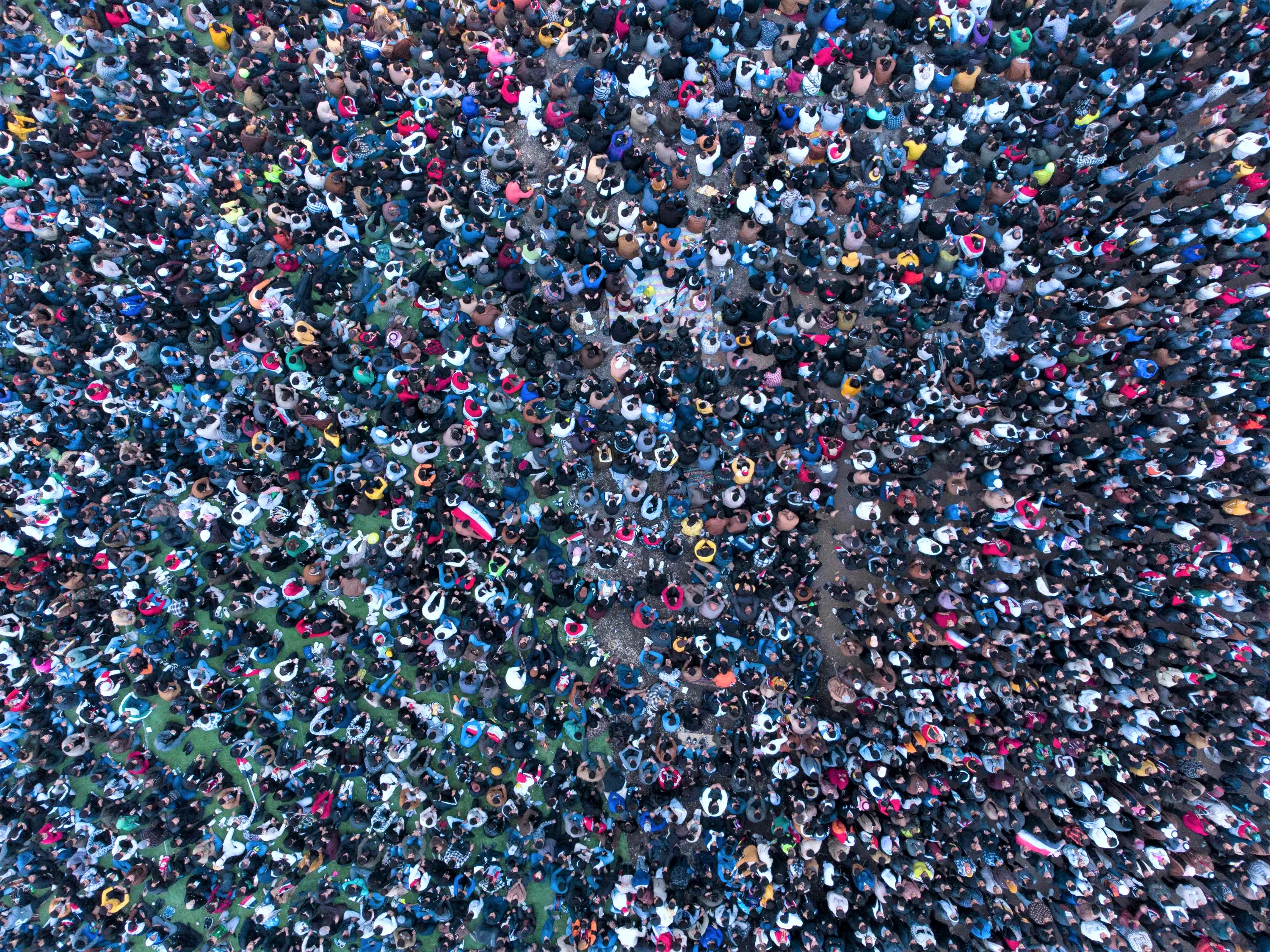 An aerial view shows Iraq supporters gathering in a designated fan zone in Iraq's southern city on January 16, 2023 to watch the Arabian Gulf Cup semi-final football match between Iraq and Qatar. (Photo by Hussein Faleh/AFP Photo)
