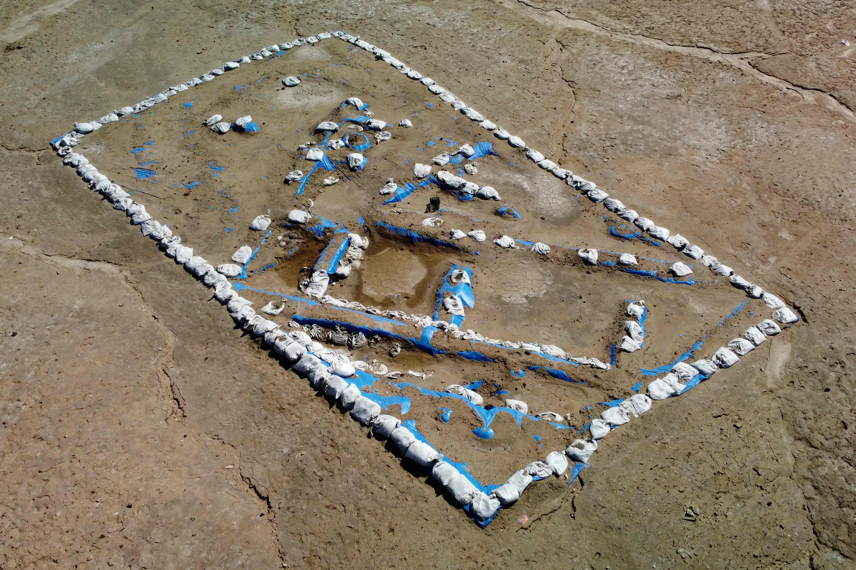 An aerial picture shows a general view of the newly-excavated trench which may have contained an inn with a cooling area for food storage, at the site of the ancient city-state of Lagash, in Iraq's al-Shatra district of the southern Dhi Qar province on February 11, 2023. Italian and US archaeologists excavating in Lagash in southern Iraq have unearthed a Sumerian “tavern” old nearly 5,000 years old, complete with benches, a cooling system acting as a refrigerator, and bowls containing leftover food. (Photo by Asaad Niazi/AFP Photo)