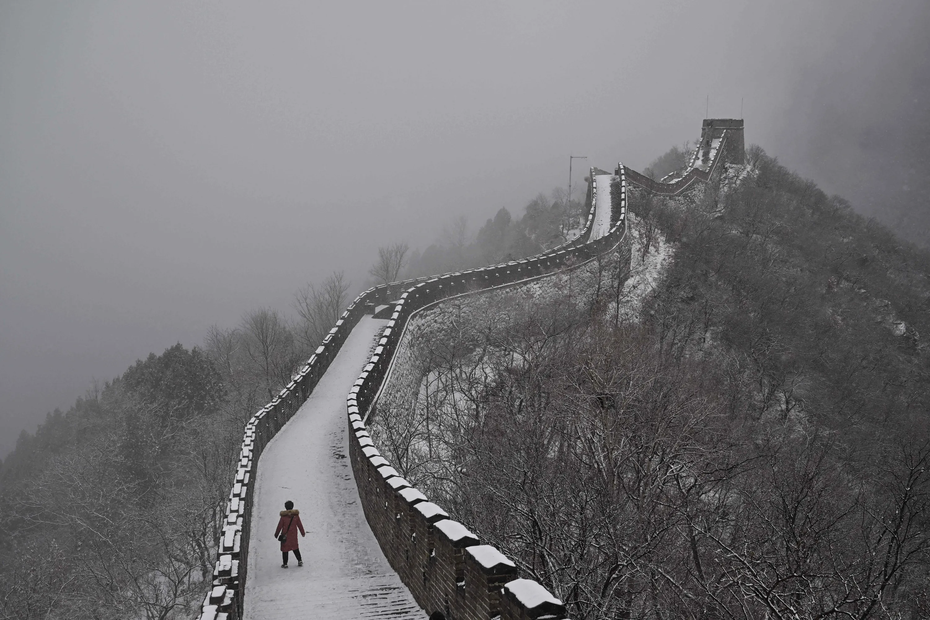 A woman visits the Great Wall in Mutianyu in the Huairou district, over 70km from Beijing on February 12, 2023. (Photo by Hector Retamal/AFP Photo)
