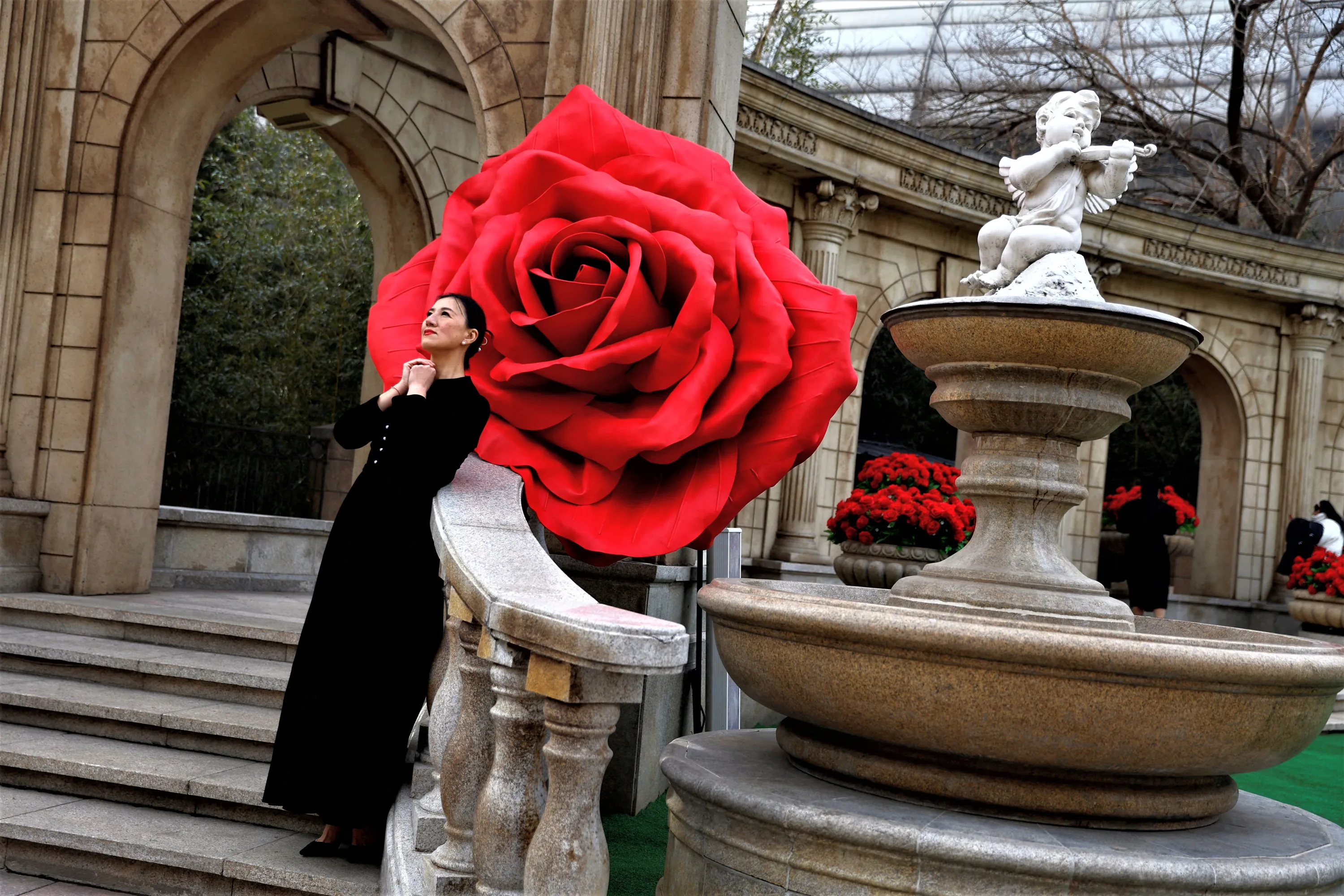 A woman poses for pictures in front of giant rose installations on Valentine's Day in Beijing, China on February 14, 2023. (Photo by Tingshu Wang/Reuters)