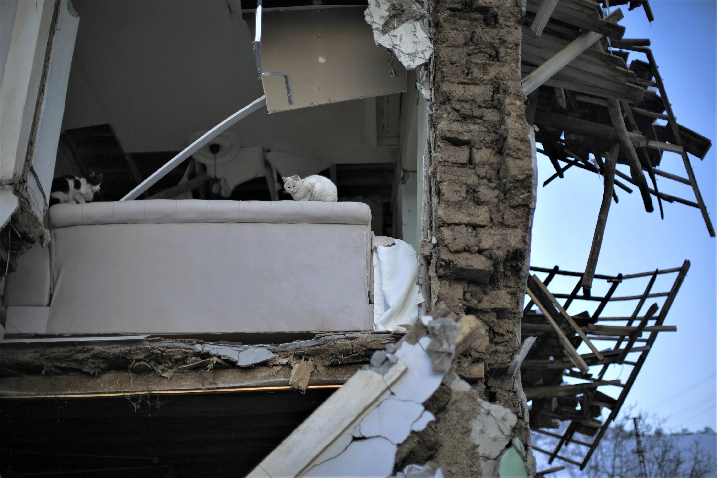 Two cats are seen in a destroyed hous in the village of Polat, Turkey, Sunday, February 12, 2023. (Photo by Francisco Seco/AP Photo)