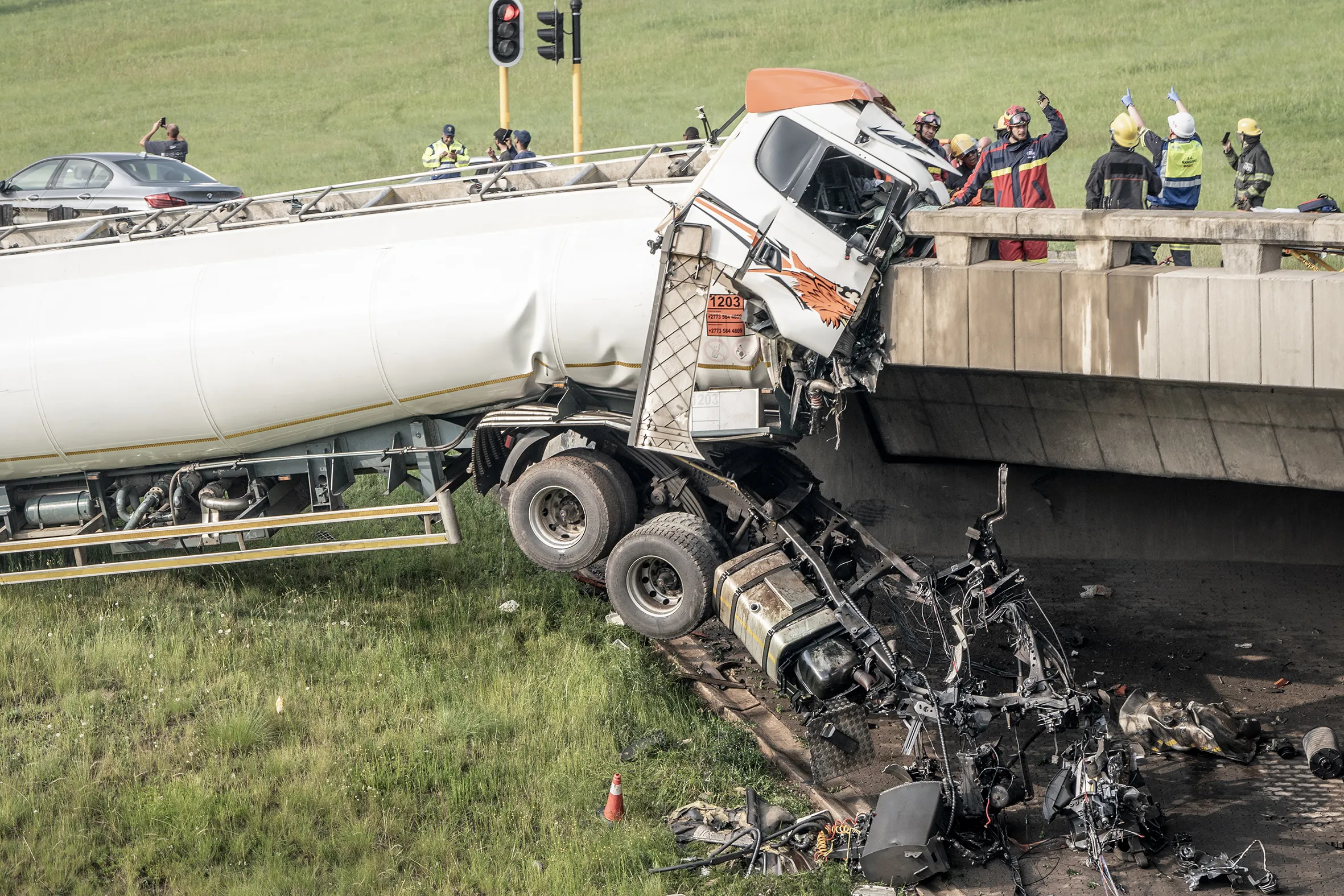 Paramedics and emergency service personnel work on the scene of a diesel tanker crash on the N12 highway in Johannesburg on January 7, 2023. (Photo by AFP Photo/Stringer)