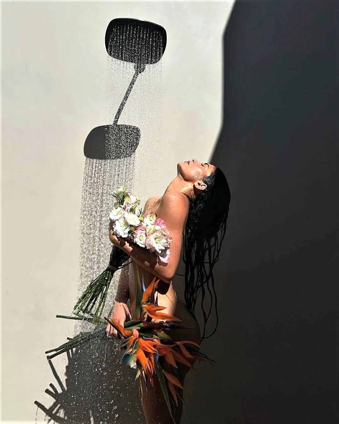 American media personality and socialite Kylie Jenner in the second decade of February 2023 puts a floral spin on an outdoor shower. (Photo by kyliejenner/Instagram)