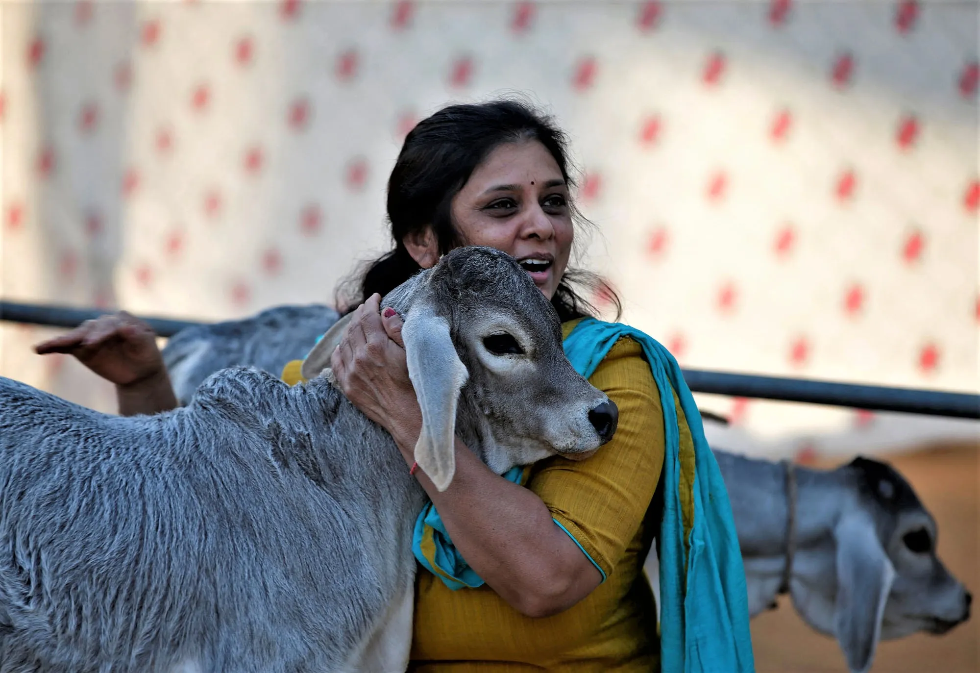 A woman hugs a calf as part of celebrations to mark “Cow Hug Day” on the occasion of Valentine's Day at a cow shelter in Ahmedabad, India on February 14, 2023. (Photo by Amit Dave/Reuters)