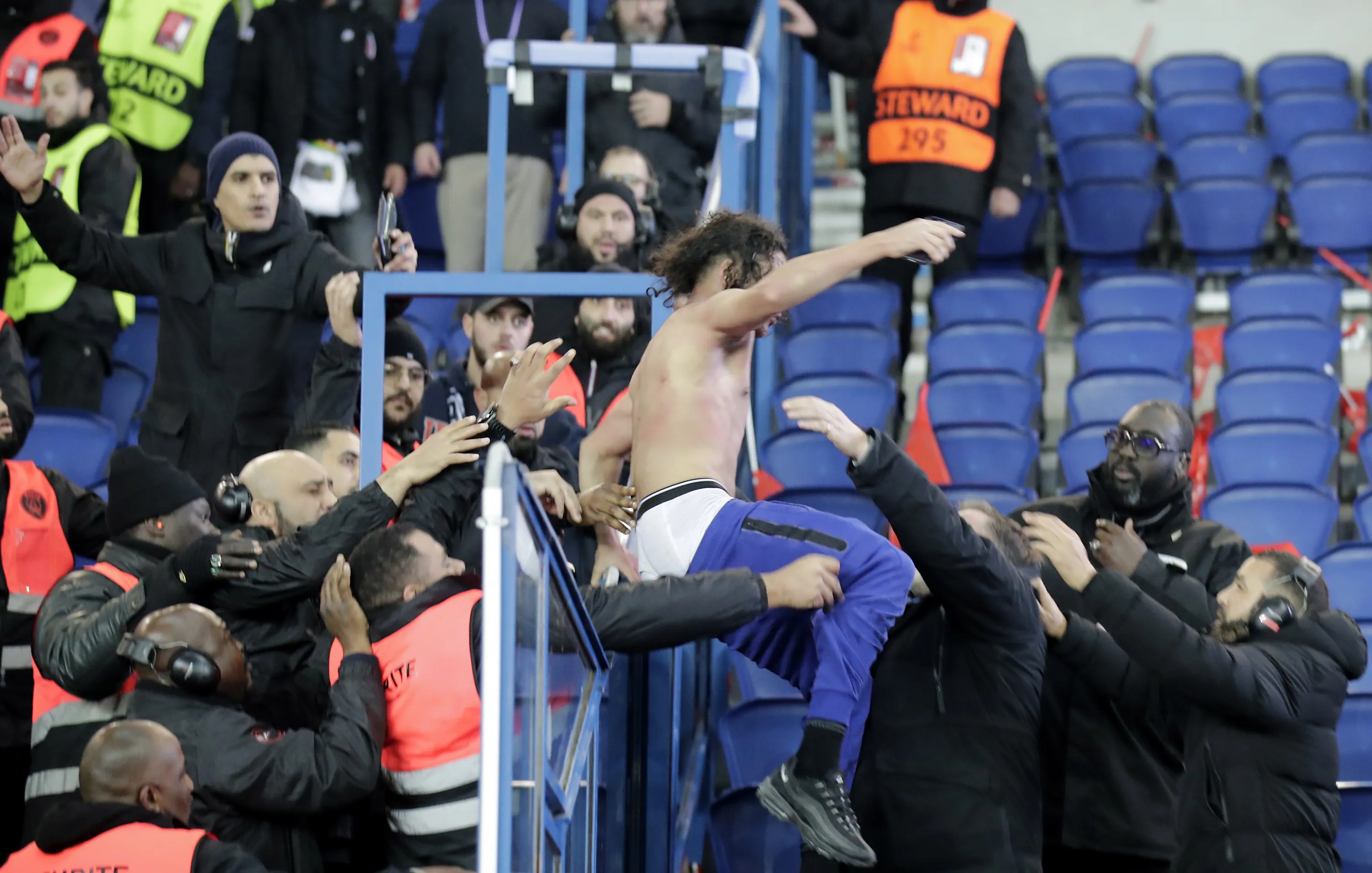 Security gaurd a Bayern supporter after he got in fights with PSG supporters after he put a Bayern Munich jersey in the stands of the PSG Ultra fans after the UEFA Champions League Round of 16, 1st leg match between Paris Saint-Germain and Bayern Munich in Paris, France, 14 February 2023. (Photo by Teresa Suarez/EPA/EFE)