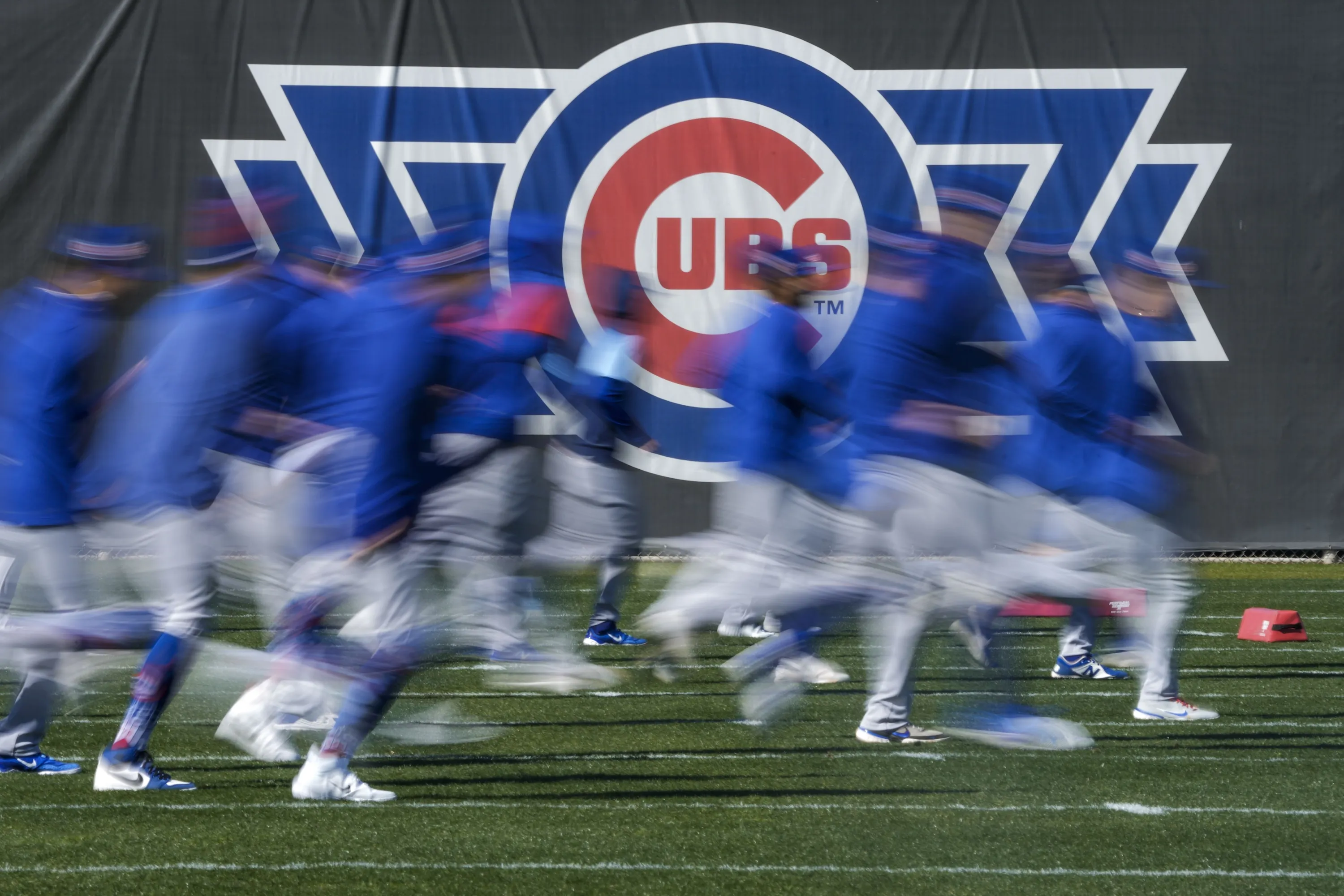 Some Chicago Cubs players run during a spring training baseball workout Wednesday, February 15, 2023, in Mesa. (Photo by Morry Gash/AP Photo)