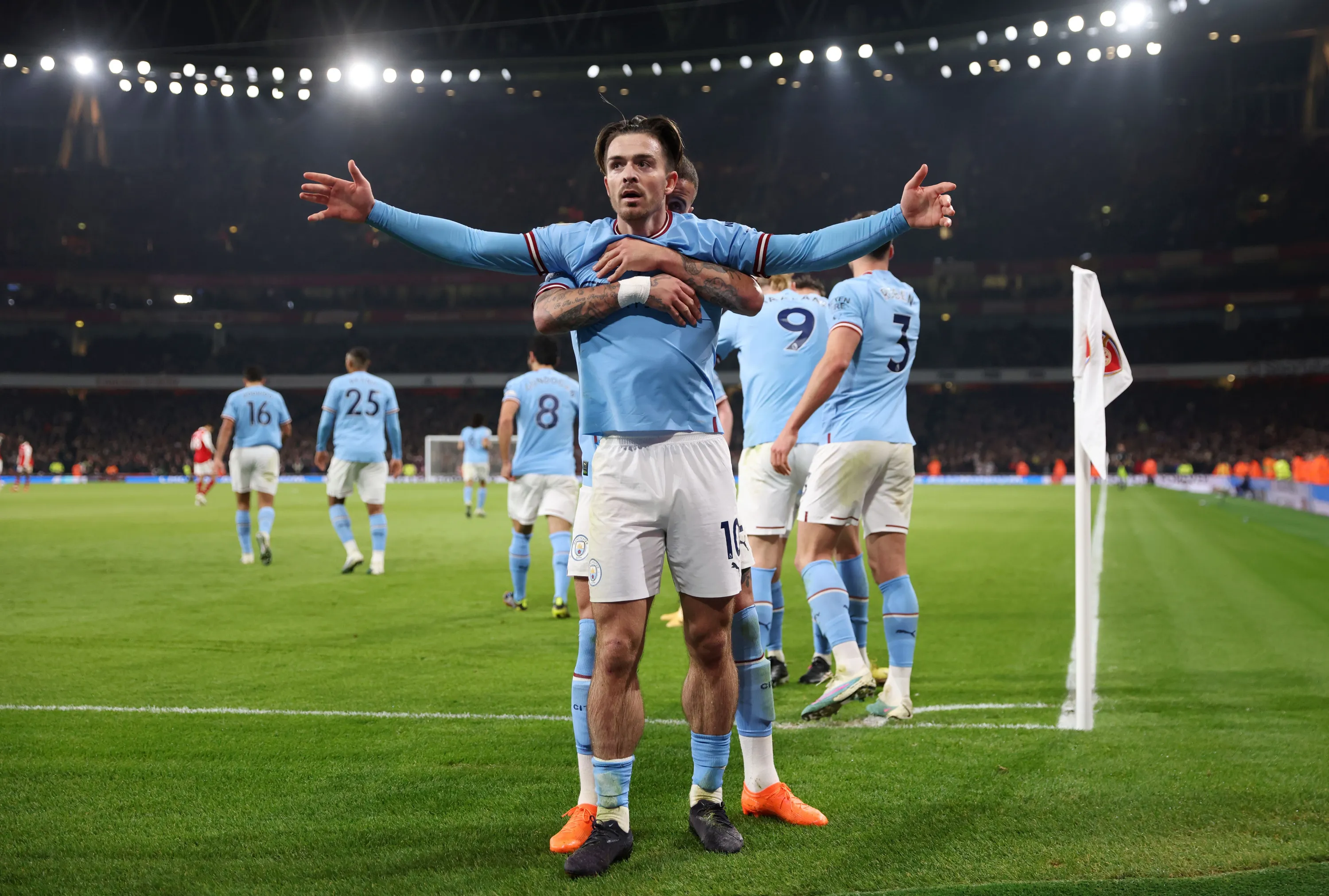 Jack Grealish of Manchester City celebrates after scoring the team's second goal with teammates during the Premier League match between Arsenal FC and Manchester City at Emirates Stadium on February 15, 2023 in London, England. (Photo by Julian Finney/Getty Images)