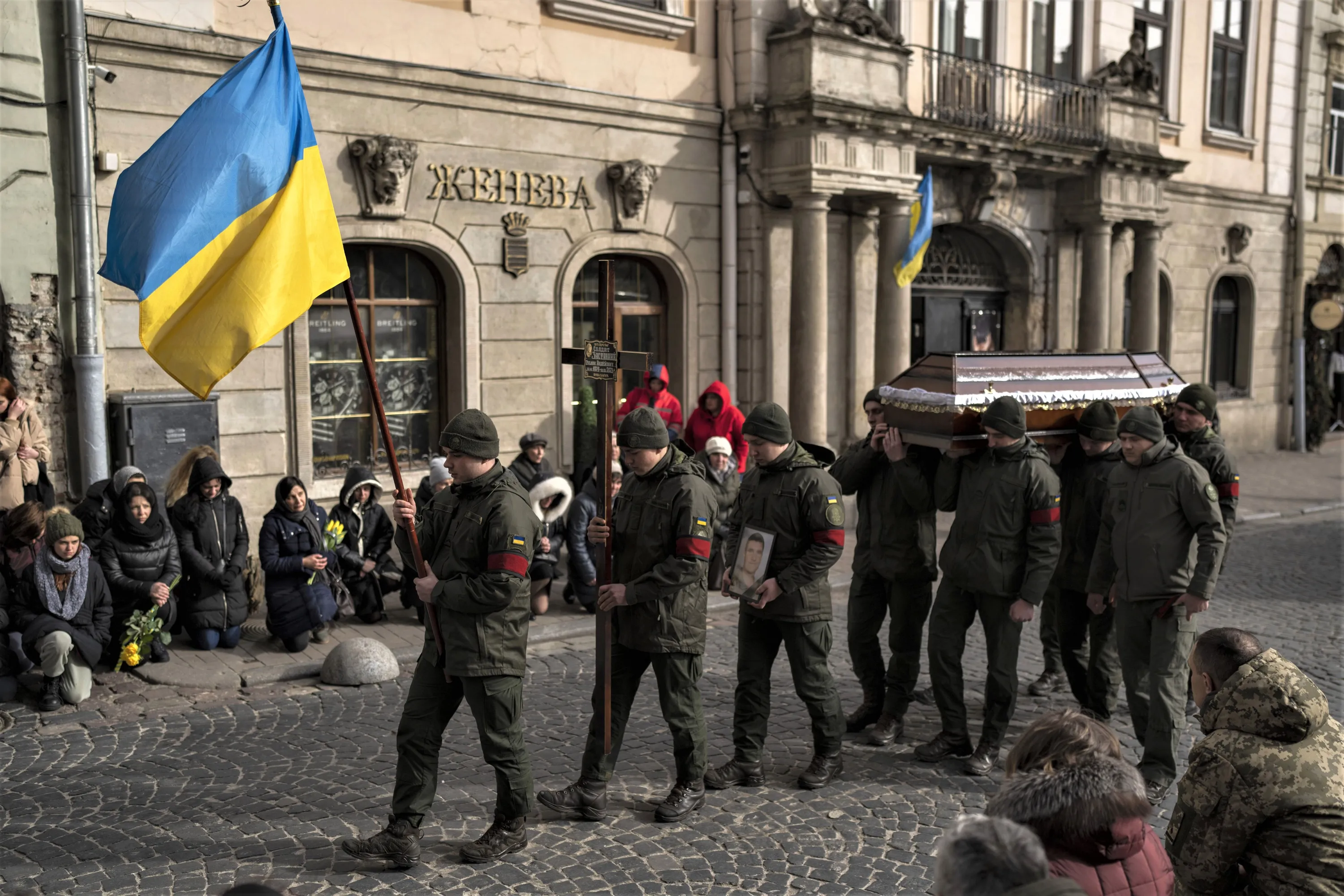 Soldiers carry the coffin of military serviceman Ruslan Zastavnyi during his funeral in Lviv, Ukraine, on Monday, February 20, 2023. Zastavnyi joined the army in March 2022, died two weeks ago near Bakhmut. (Photo by Petros Giannakouris/AP Photo)