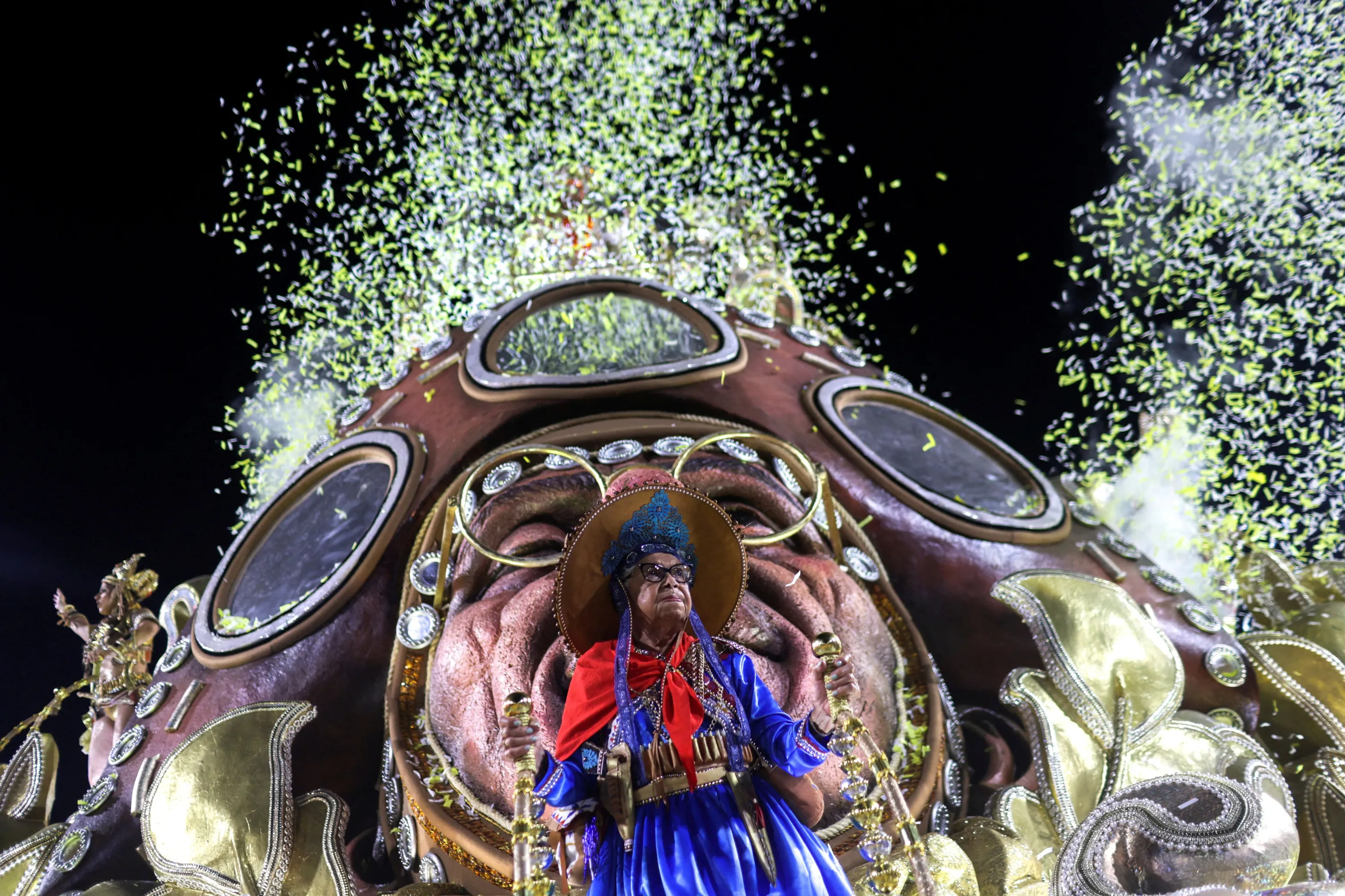 A reveller from Imperatriz Leopoldinense samba school performs during the second night of the carnival parade at the Sambadrome, in Rio de Janeiro, Brazil on February 21, 2023. (Photo by Ricardo Moraes/Reuters)