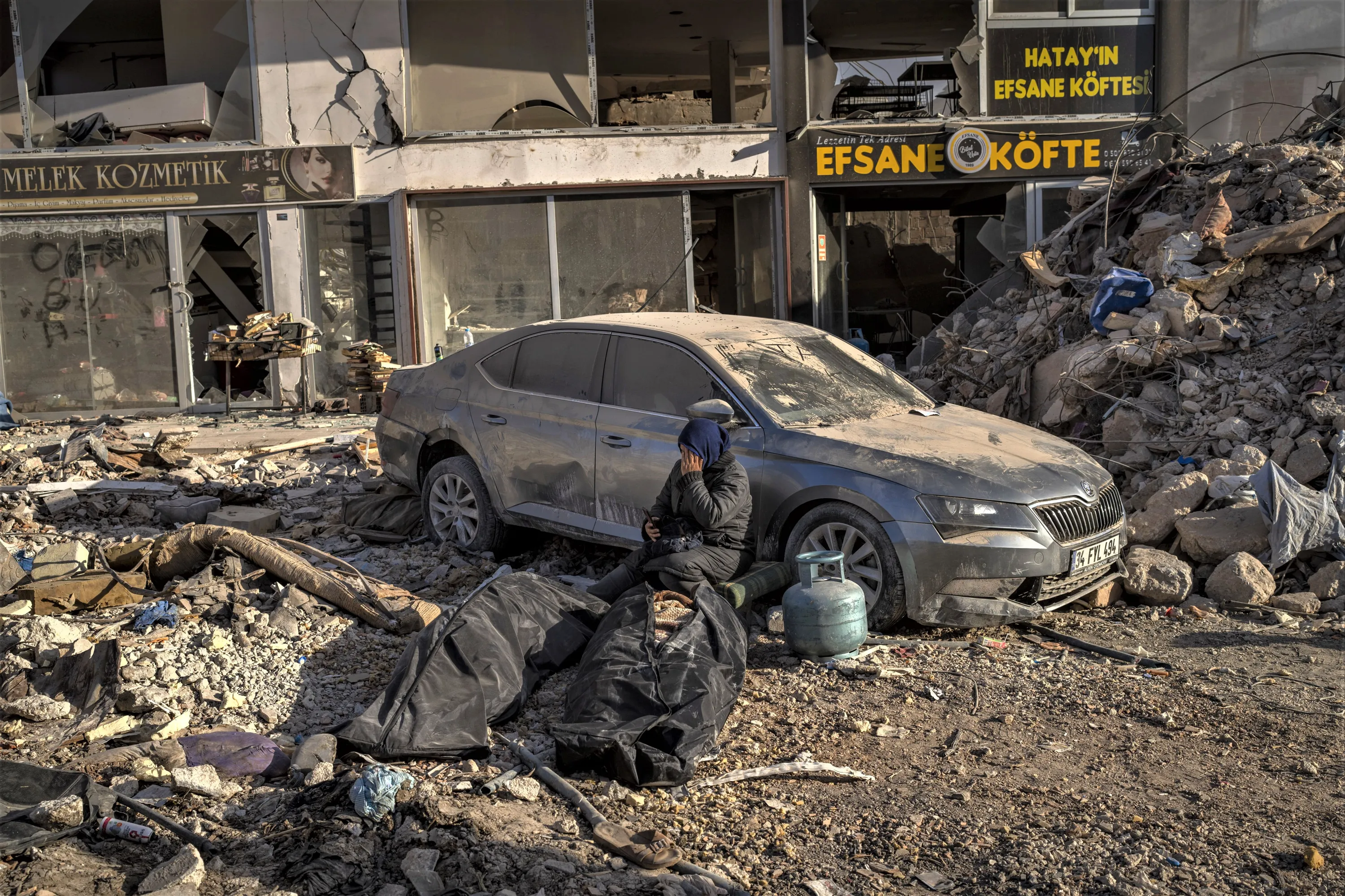 A woman sits next to bodies that were pulled from the rubble of a destroyed building in Antakya, southeastern Turkey, Wednesday, February 15, 2023. (Photo by Bernat Armangue/AP Photo)