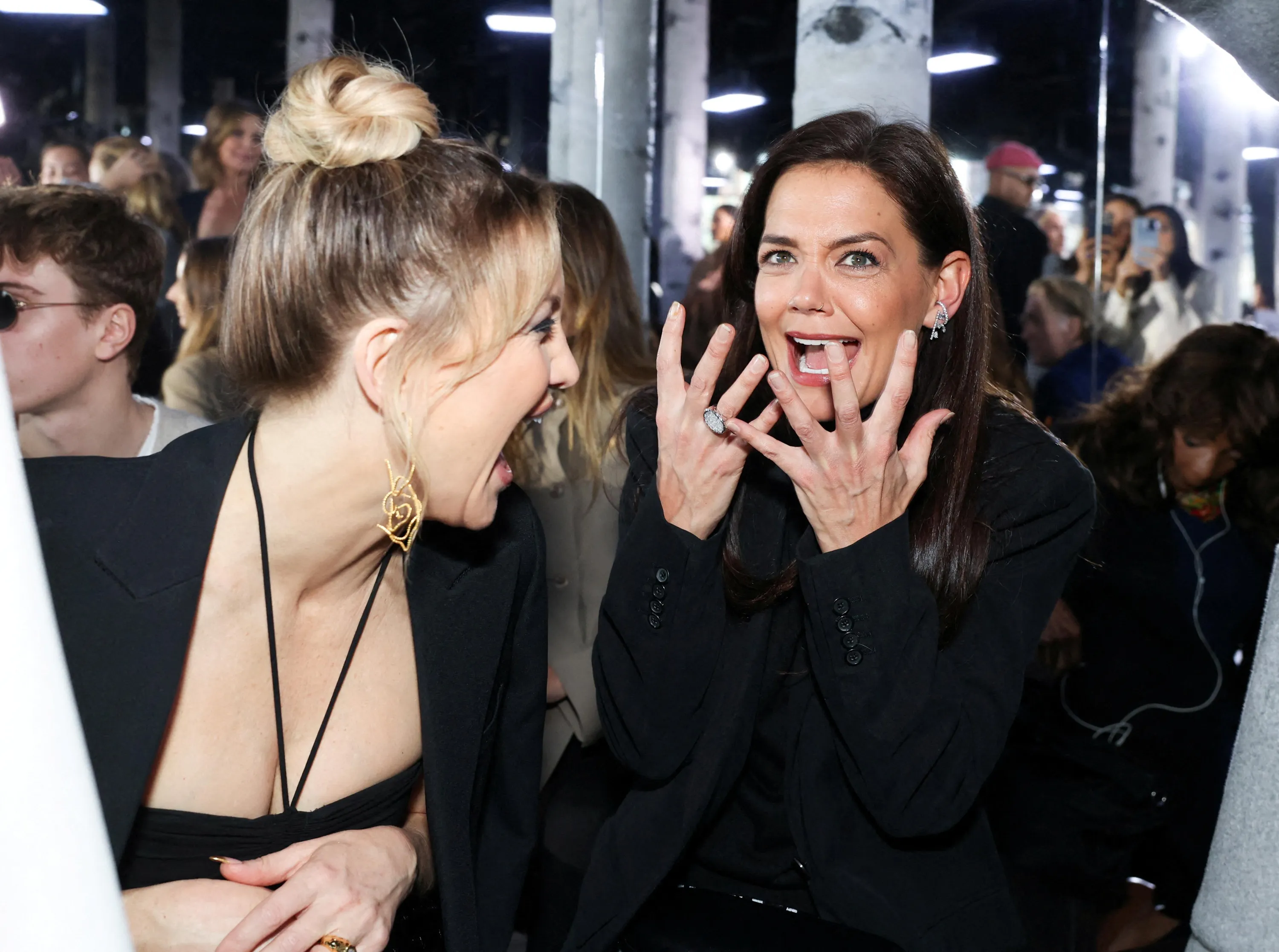 Actresses Kate Hudson and Katie Holmes react while attending the Michael Kors show during the New York Fashion Week in New York City, New York, U.S., February 15, 2023. (Photo by Caitlin Ochs/Reuters)