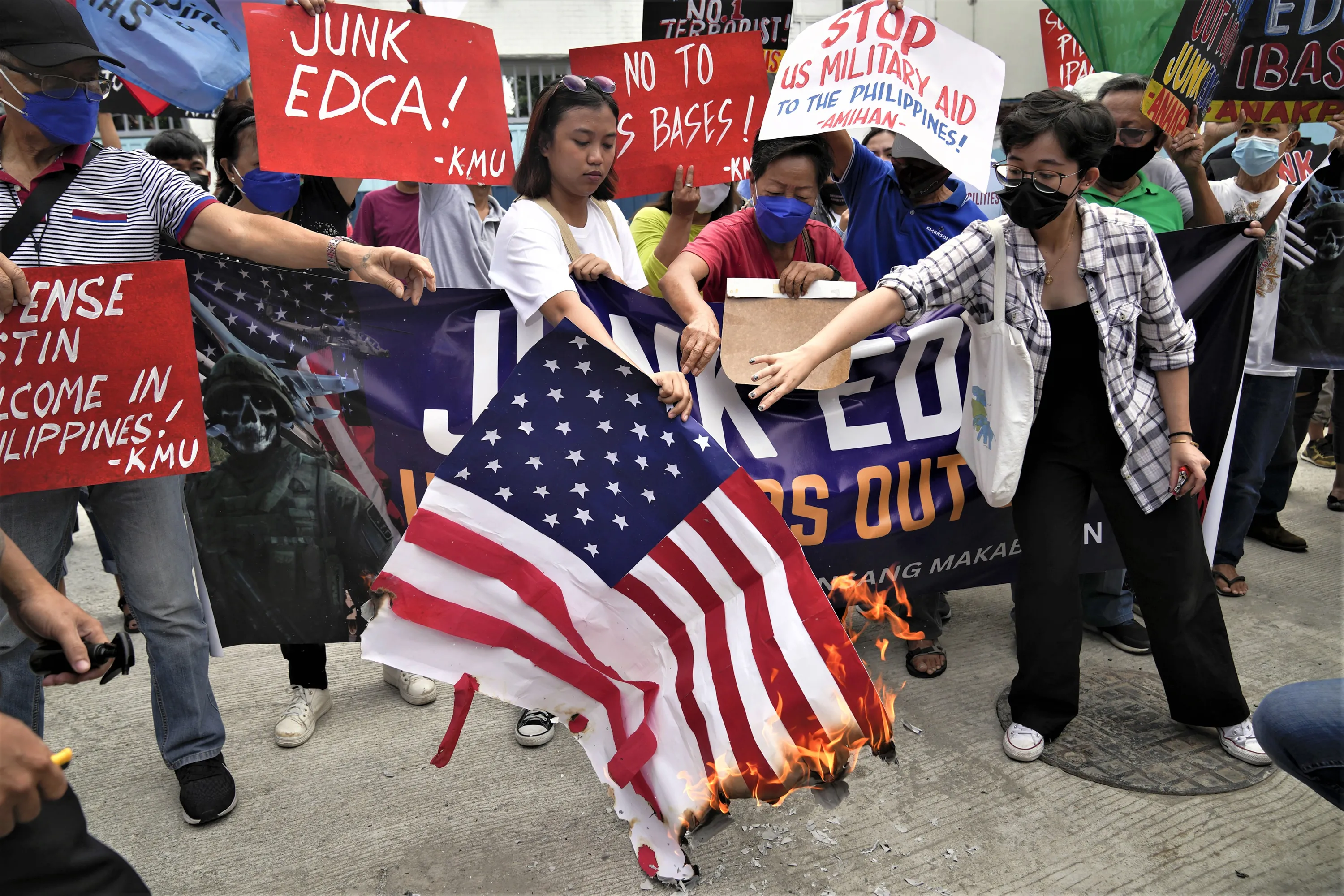 Demonstrators burn a mock U.S. flag as they protest against the visit of U.S. Defense Secretary Lloyd Austin outside Camp Aguinaldo military headquarters in metro Manila, Philippines on Thursday, February 2, 2023. Austin is in the Philippines for talks about deploying U.S. forces and weapons in more Philippine military camps to ramp up deterrence against China's increasingly aggressive actions toward Taiwan and in the disputed South China Sea. (Photo by Aaron Favila/AP Photo)