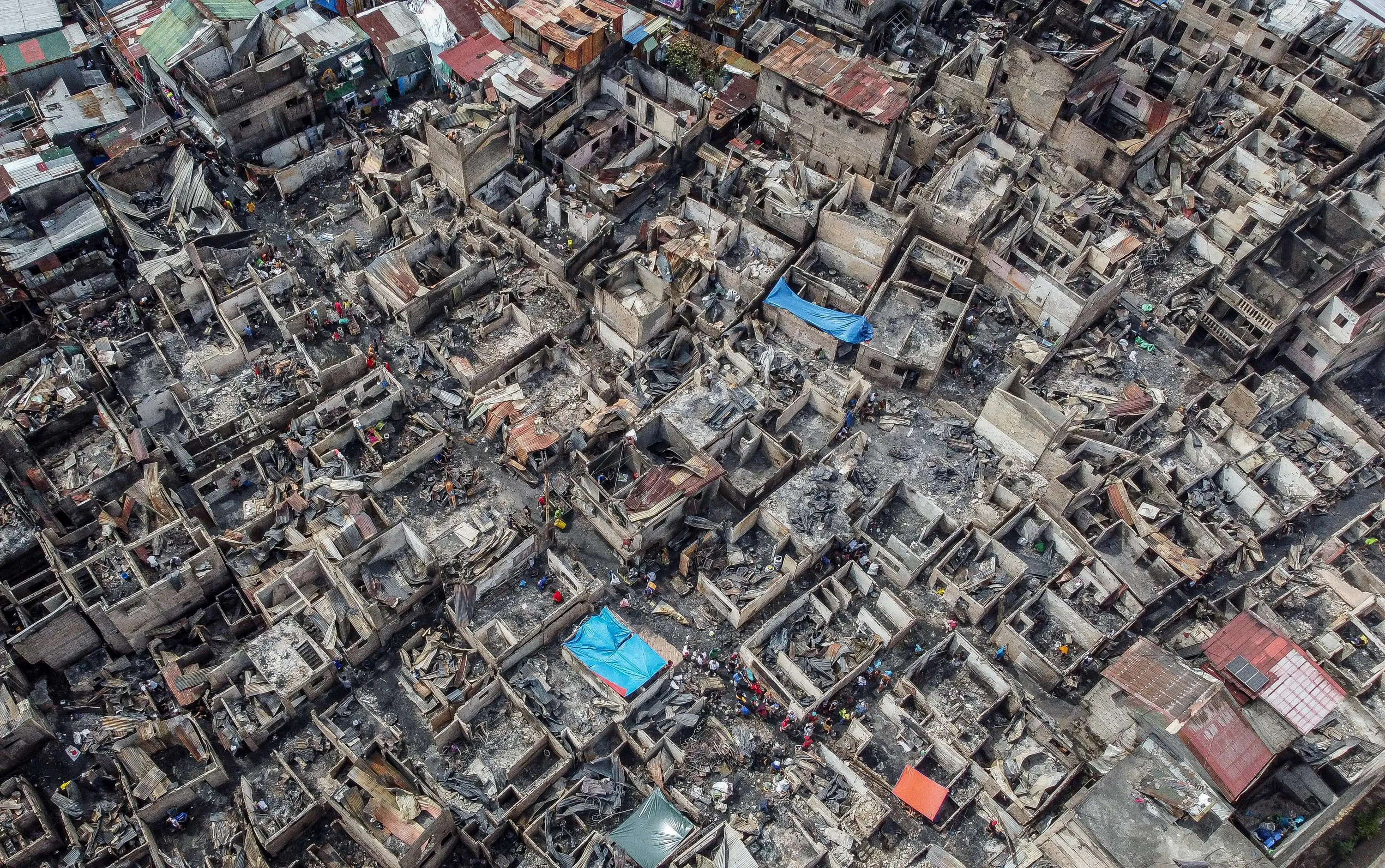 This aerial photo taken on February 2, 2023 shows the charred houses after a fire at a slum area in Quezon City, the Philippines. Hundreds of families were left homeless after a fire engulfed a slum area in Quezon City Wednesday afternoon, according to the Philippine Bureau of Fire Protection. (Photo by Xinhua News Agency/Rex Features/Shutterstock)