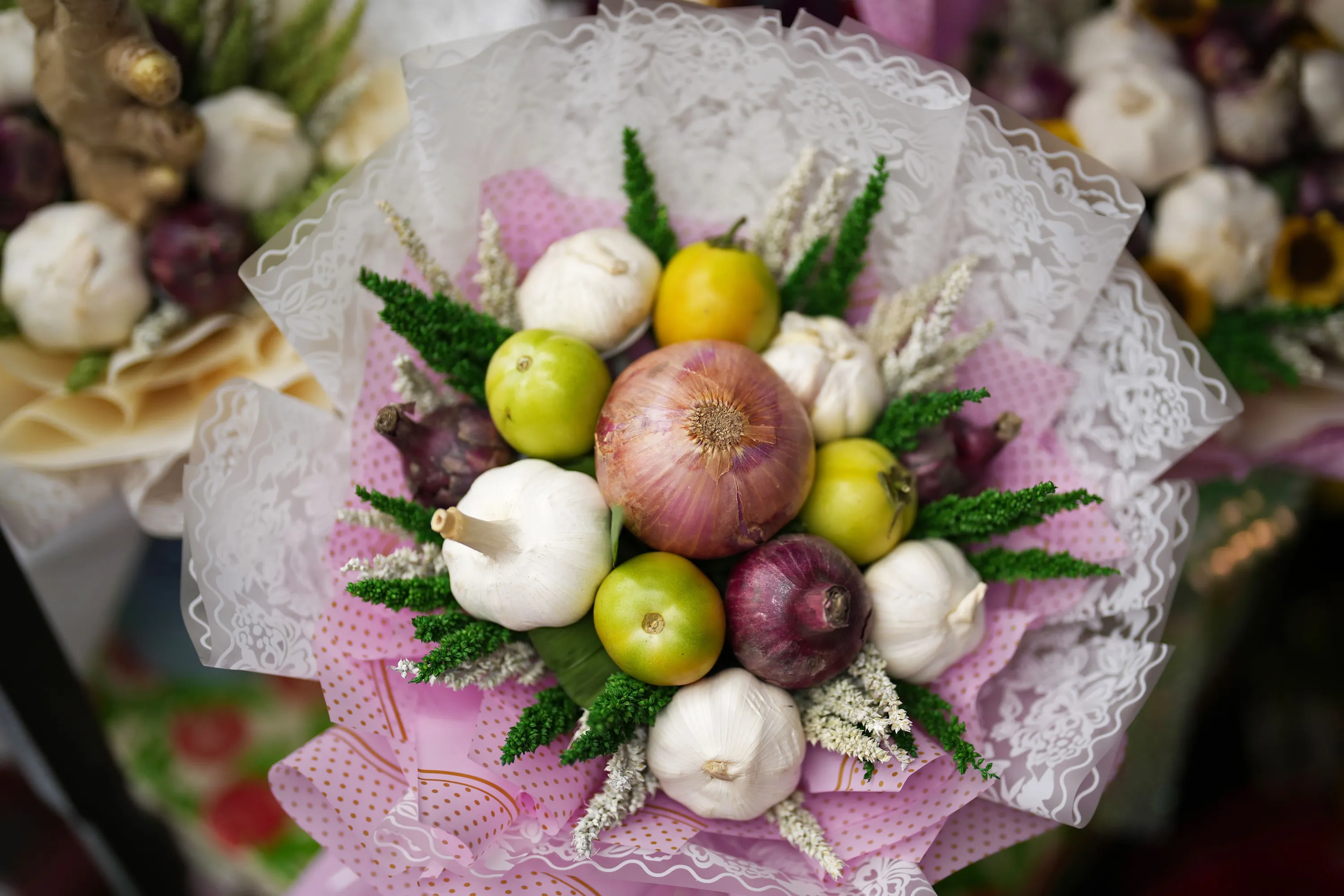 A bouquet made of onions, tomatoes and garlic is displayed at a flower market in Manila, Philippines on Monday, February 13, 2023. The bouquet is part of a Valentines Day gimmick by a flower store owner who says it is more practical than giving flowers because you can cook it after. She sells the vegetable bouquets from 500 to 1,500 pesos (US$9 to US$27) depending on their choice of onions, ginger, garlic, tomatoes and red or green chilies. (Photo by Aaron Favila/AP Photo)