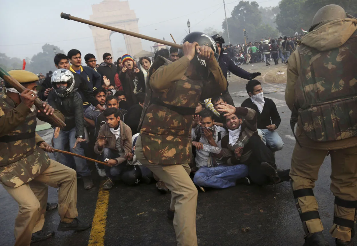 Protesters shield themselves as Indian police prepare to beat them during a violent demonstration near the India Gate, on December 23, 2012. (Photo by Kevin Frayer/AP Photo)