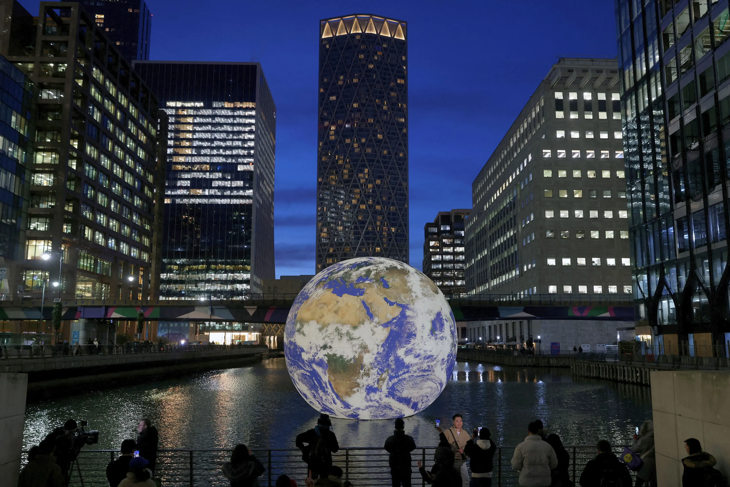 People look at Luke Jerram's “Floating Earth”, an installation as part of the Canary Wharf Winter Lights festival in the financial district in London, Britain on January 17, 2023. (Photo by Kevin Coombs/Reuters)