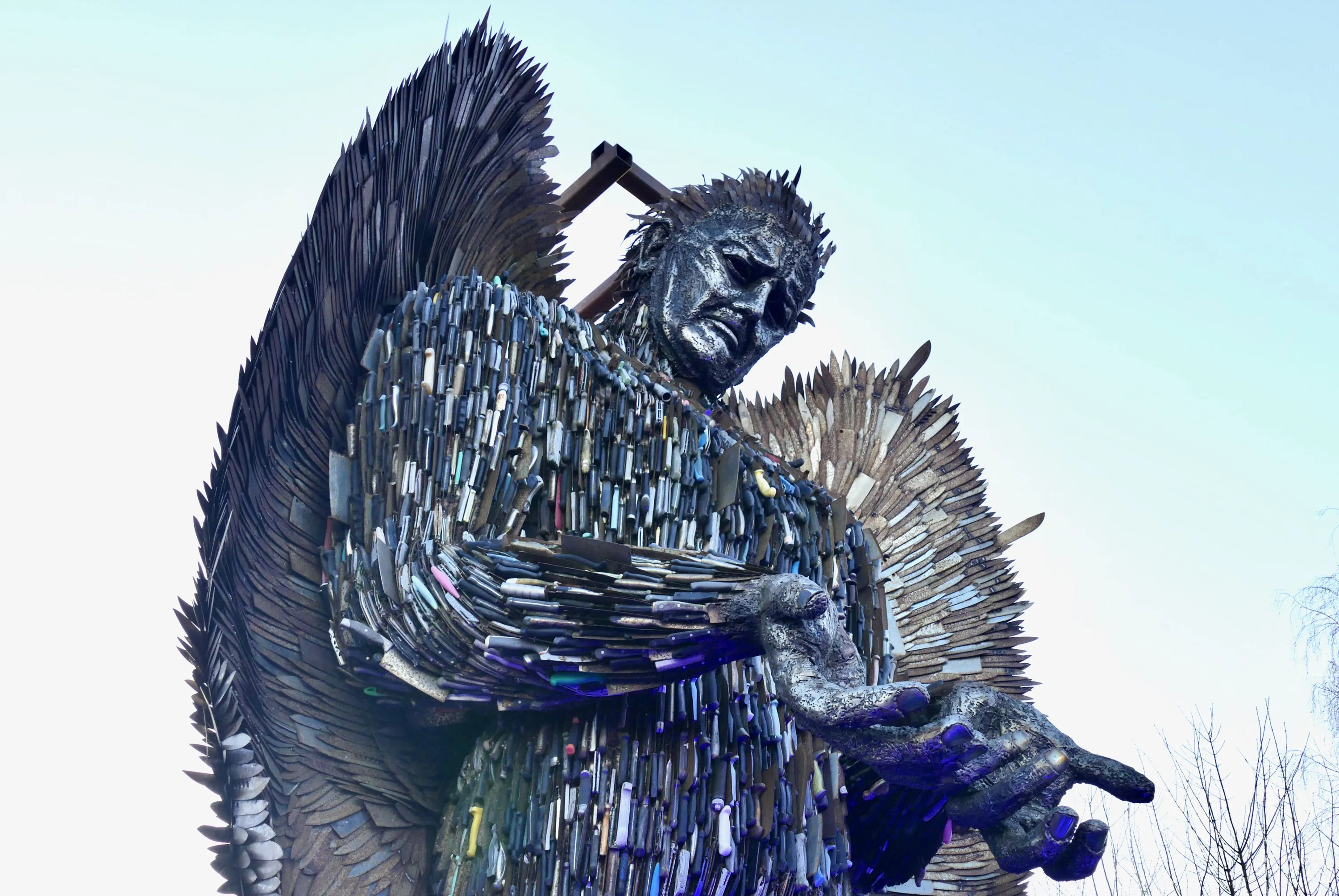 The Knife Angel at Arbour Park in Berkshire, United Kingdom on January 11, 2023. A sculpture made from knives has arrived in Slough in a bid to raise awareness about violent crime. Standing 27ft (8m) high, the Knife Angel is made from about 100,000 bladed weapons collected through knife amnesty bins from 43 police forces. It features messages from families of the victims of knife crime engraved on its wings. Members of Thames Valley Police will be at the sculpture daily to talk about knife crime with anyone visiting. (Photo by Geoffrey Swaine/Rex Features/Shutterstock)