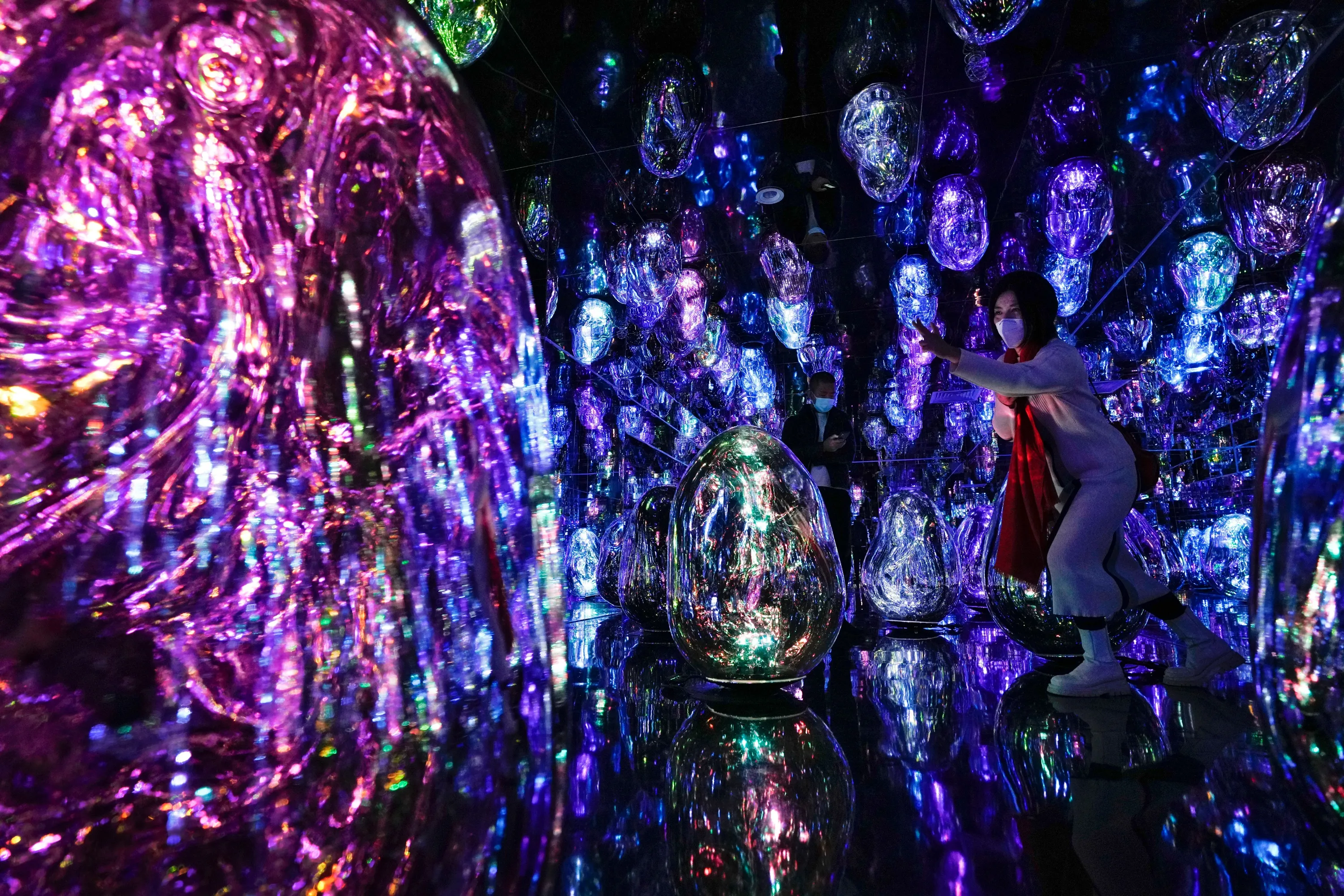 A masked woman gestures as visitors interact with immersive digital art installation titled Resonating Microcosms, Solidified Light Color, at the newly opened “teamLab Massless” museum in Beijing, Monday, December 26, 2022. The “teamLab Massless” by Tokyo-based art collective teamLab create the digital art museum showcasing various interactive artworks inside a shopping mall in the capital city of Beijing. (Photo by Andy Wong/AP Photo)