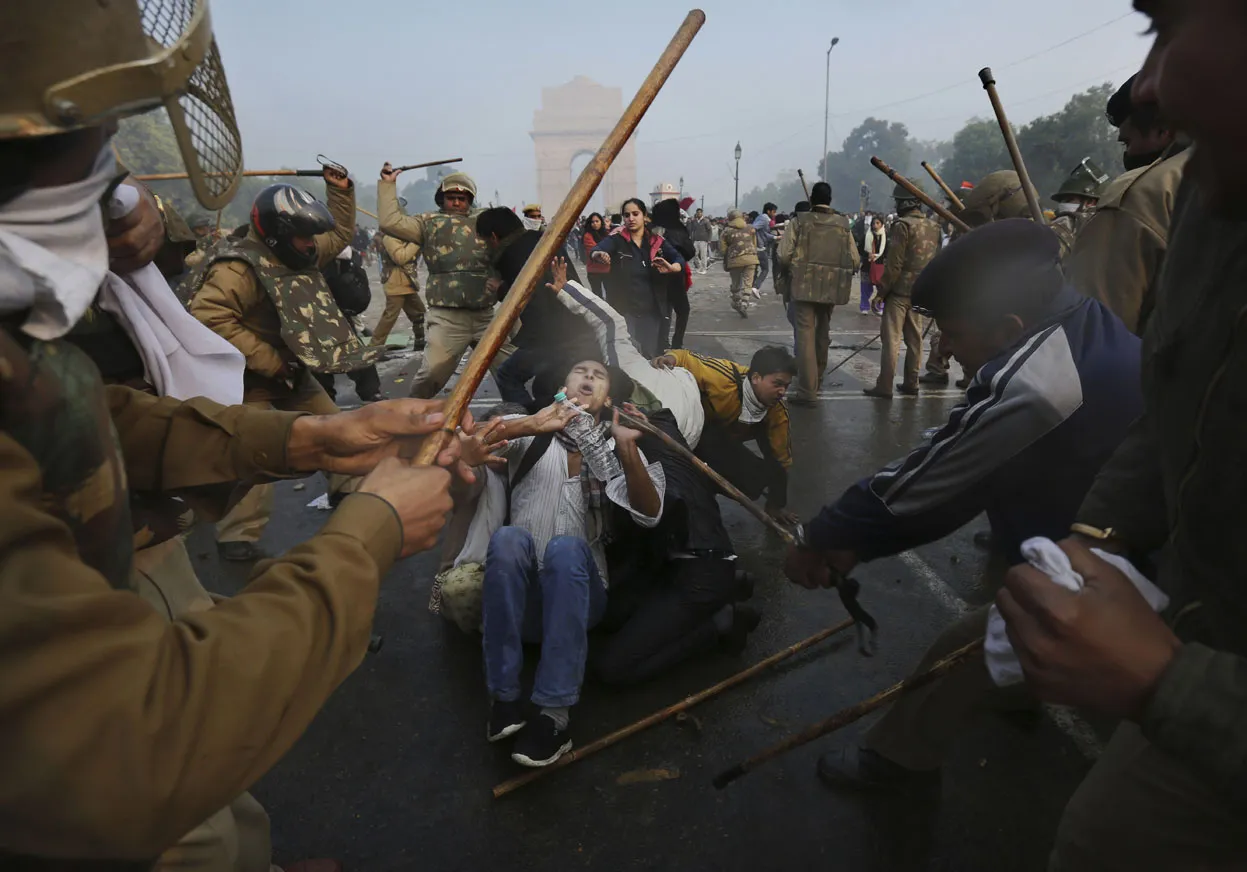 Protesters shield themselves as Indian police beat them with sticks during a violent demonstration near the India Gate in New Delhi, on December 23, 2012. (Photo by Kevin Frayer/AP Photo)