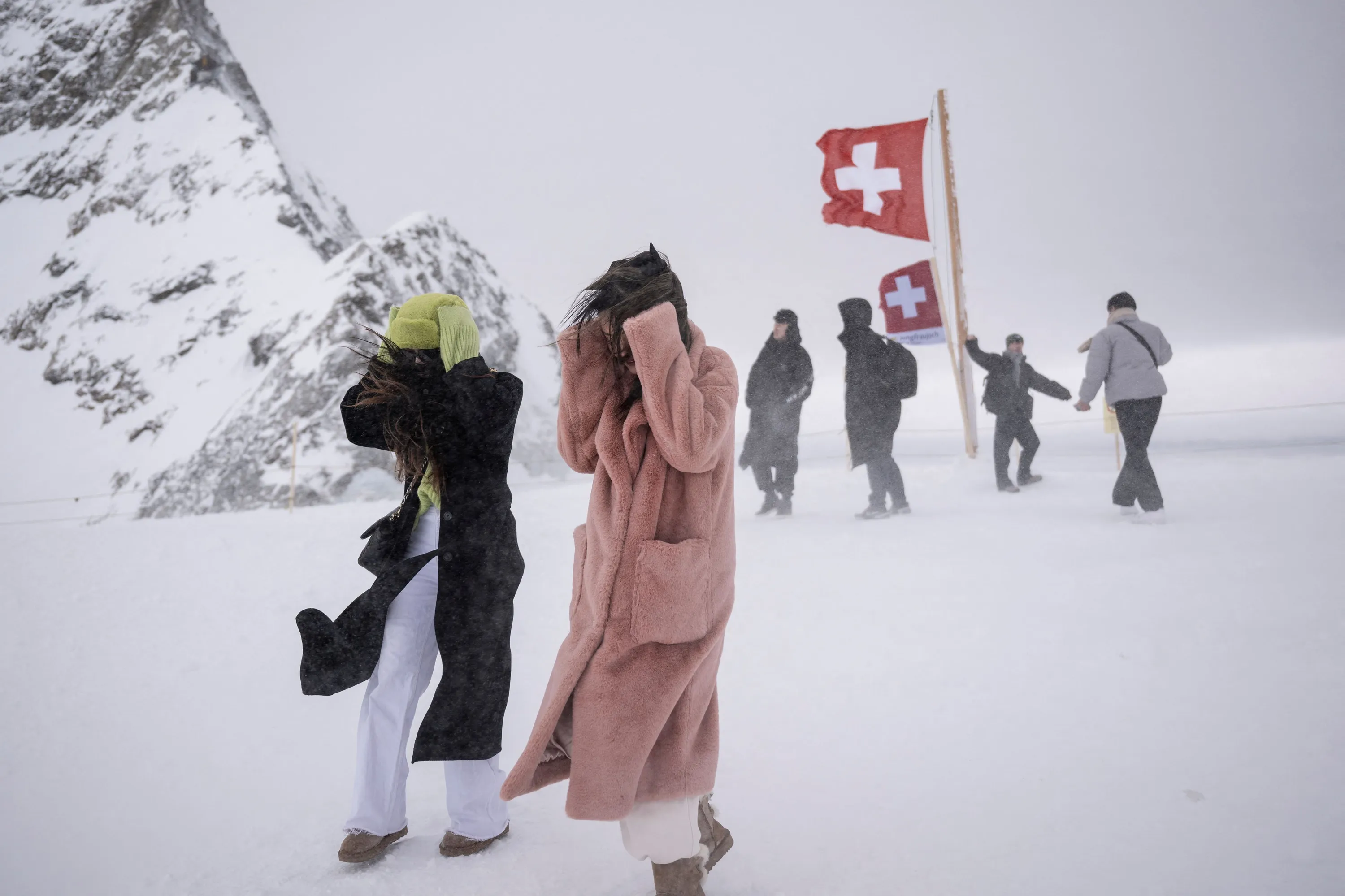 Tourists take shelter from the wind during their trip at the Jungfraujoch, 3500 meters high in the Swiss Alps, above the village of Wengen on January 12, 2023. (Photo by Marco Bertorello/AFP Photo)