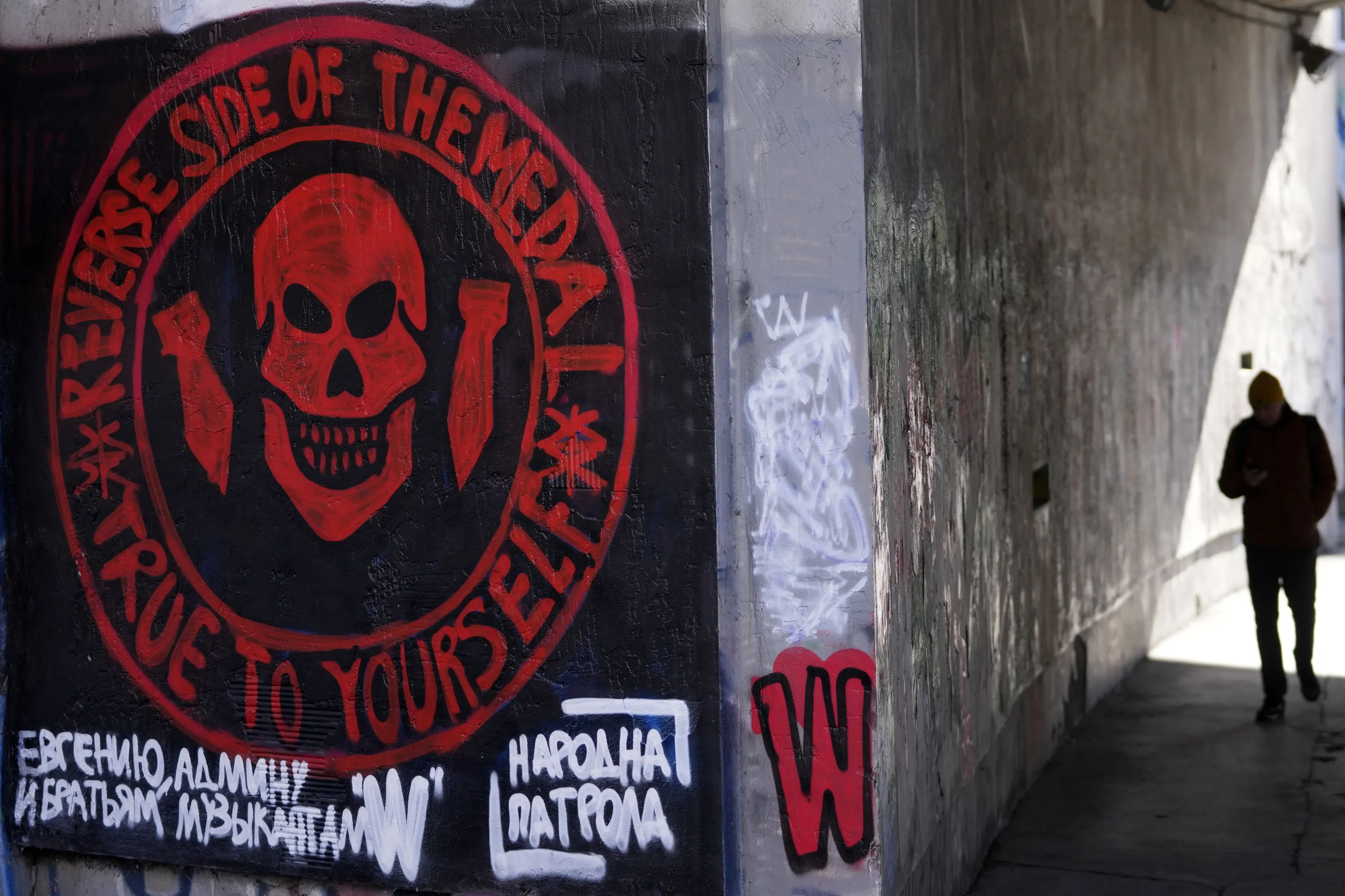 A man walks by a drawn again mural depicting the logo of Russia's Wagner Group on a wall in Belgrade, Serbia, Thursday, January 19, 2023. A friendly, fellow-Slavic nation, Serbia has welcomed the fleeing Russians who need visas to travel to much richer Western European states. But in Serbia, they have not escaped the long reach of Putin's hardline regime influence. (Photo by Darko Vojinovic/AP Photo)
