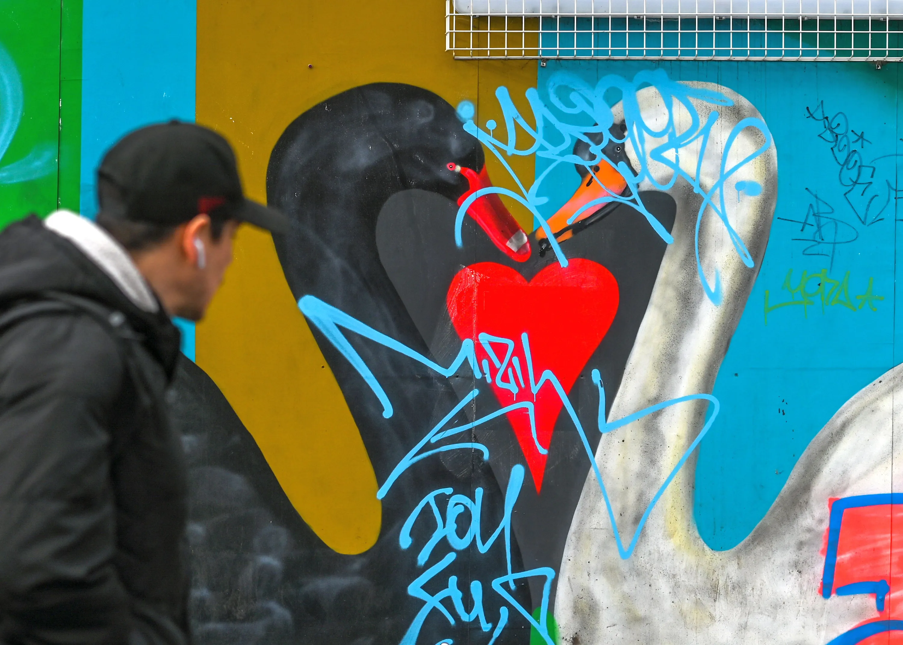 A man walks past a mural with swans in Portobello, Dublin, Ireland, on February 12, 2023. (Photo by Artur Widak/NurPhoto via Getty Images)