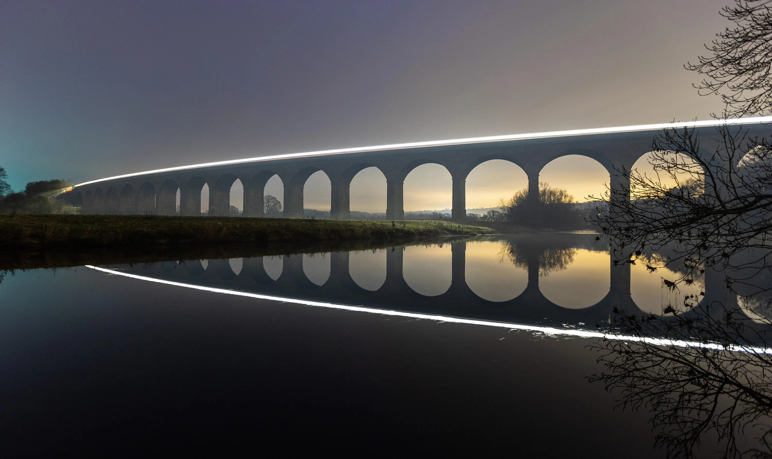A train is photographed with a 30-second exposure as it crosses Arthington Viaduct in Yorkshire on January 24, 2023. (Photo by Andrew McCaren/London News Pictures)