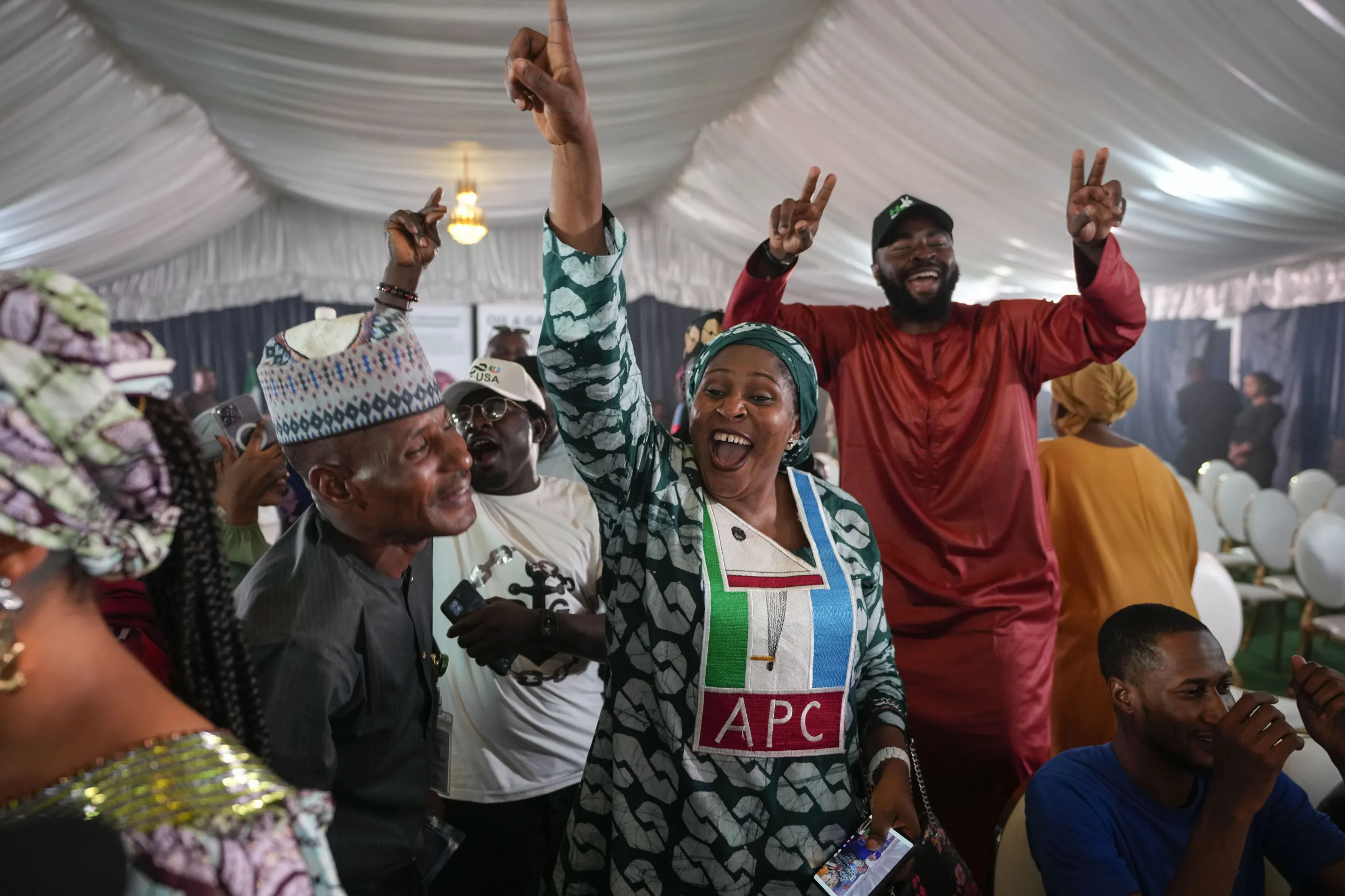 Supporters of Presidential candidate Bola Tinubu of the All Progressives Congress celebrate ahead of the final declaration of election results, at his campaign headquarters in Abuja, Nigeria Wednesday, March 1, 2023. Tensions rose in Nigeria Tuesday as the main opposition parties demanded a revote for the country's presidential election, where the latest results show an early lead for the ruling party. (Photo by Ben Curtis/AP Photo)