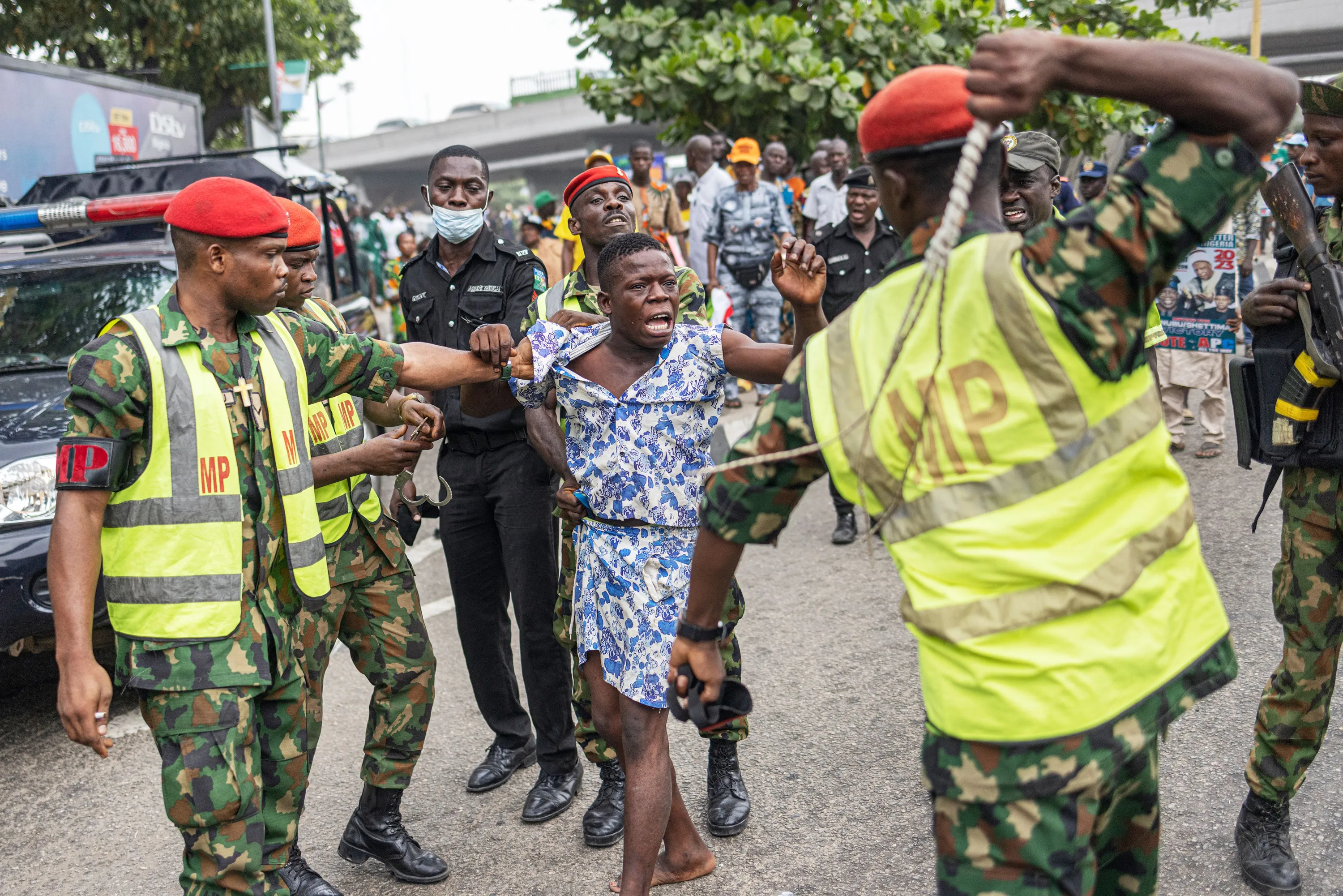 Members of the Nigerian Army Military Police detain with violence a man suspected of smoking illegal substances during a rally for the All Progressives Congress (APC) presidential candidate Bola Ahmed Tinubu at Teslim Balogun Stadium in Lagos on February 21, 2023 ahead of the Nigerian presidential election scheduled for February 25, 2023. (Photo by Michele Spatari/AFP Photo)
