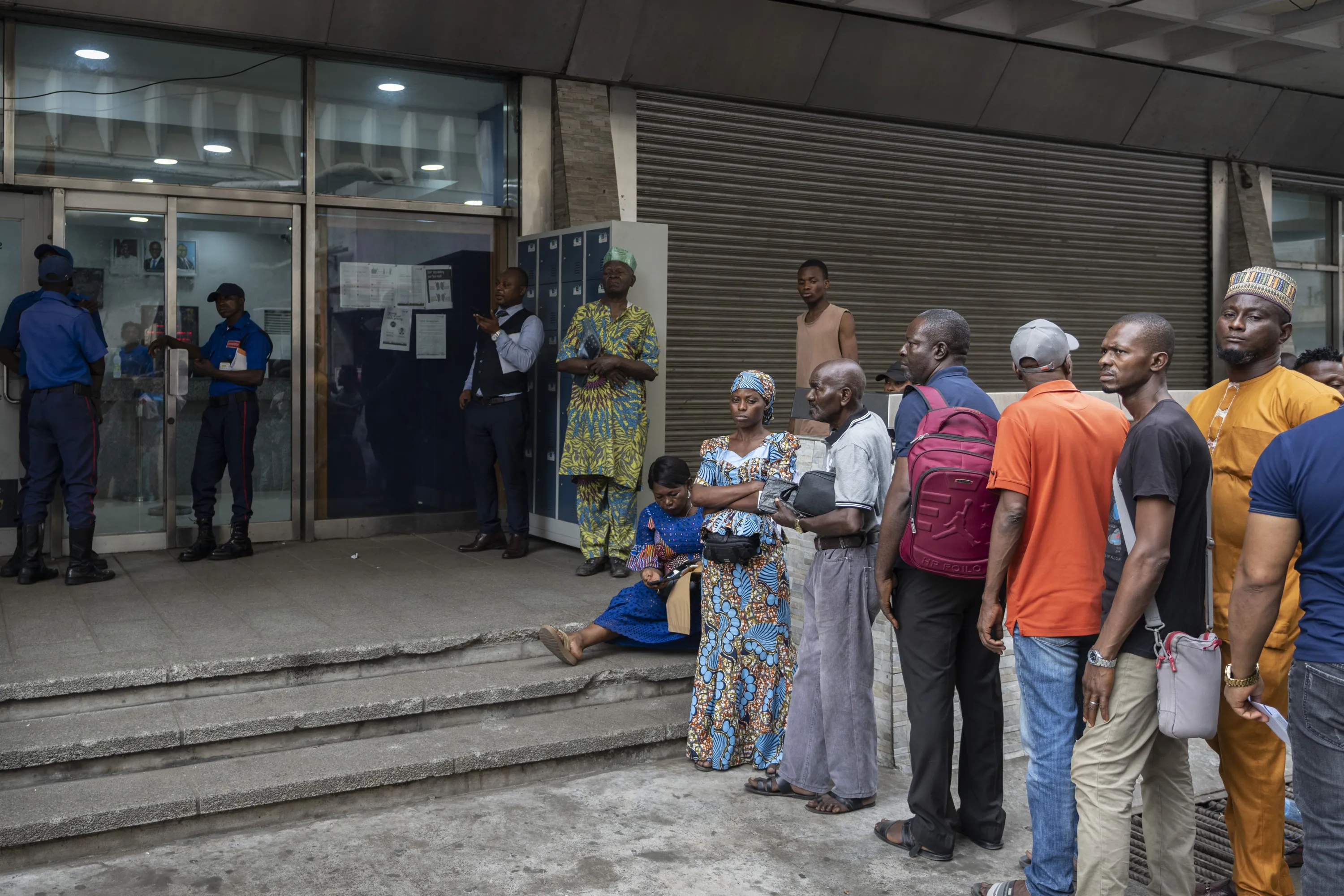 Customers who had waited for many hours stand outside a bank in the slim hope of being able to withdraw some cash, in Lagos, Nigeria Thursday, February 23, 2023. Voters will elect a new leader Saturday after President Muhammadu Buhari's final term ends, with 18 candidates vying to lead a country facing a series of struggles – the newest and most pressing being a shortage of cash. (Photo by Ben Curtis/AP Photo)