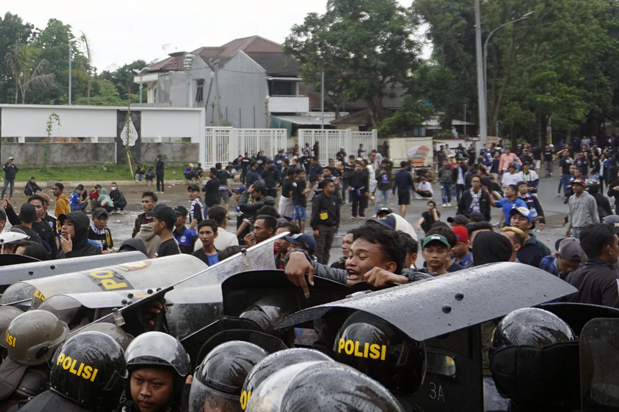 Riot police officers block soccer supporters outside Jatidiri Stadium in Semarang, Central Java, Indonesia, Friday, February 17, 2023. Indonesian police fired tear gas to disperse fans who were trying to force their way into a match that was held without spectators, months after the use of tear gas in another stadium in East Java caused one of the world's worst sporting disasters. (Photo by Adhik Kurniawan/AP Photo)