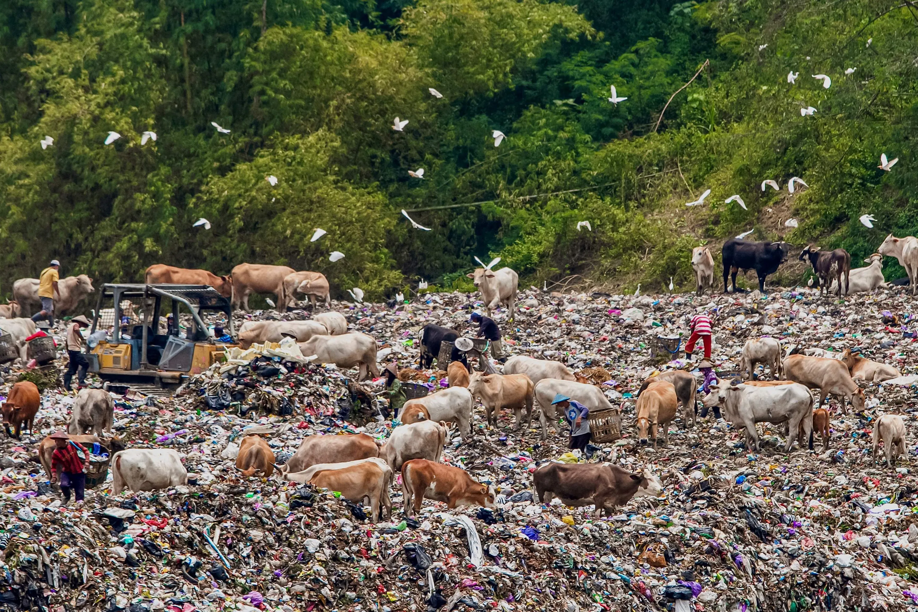Scavengers, cattles and birds scavenge garbage at the dump site at Piyungan Hill in Bantul on February 28, 2023. (Photo by Devi Rahman/AFP Photo)