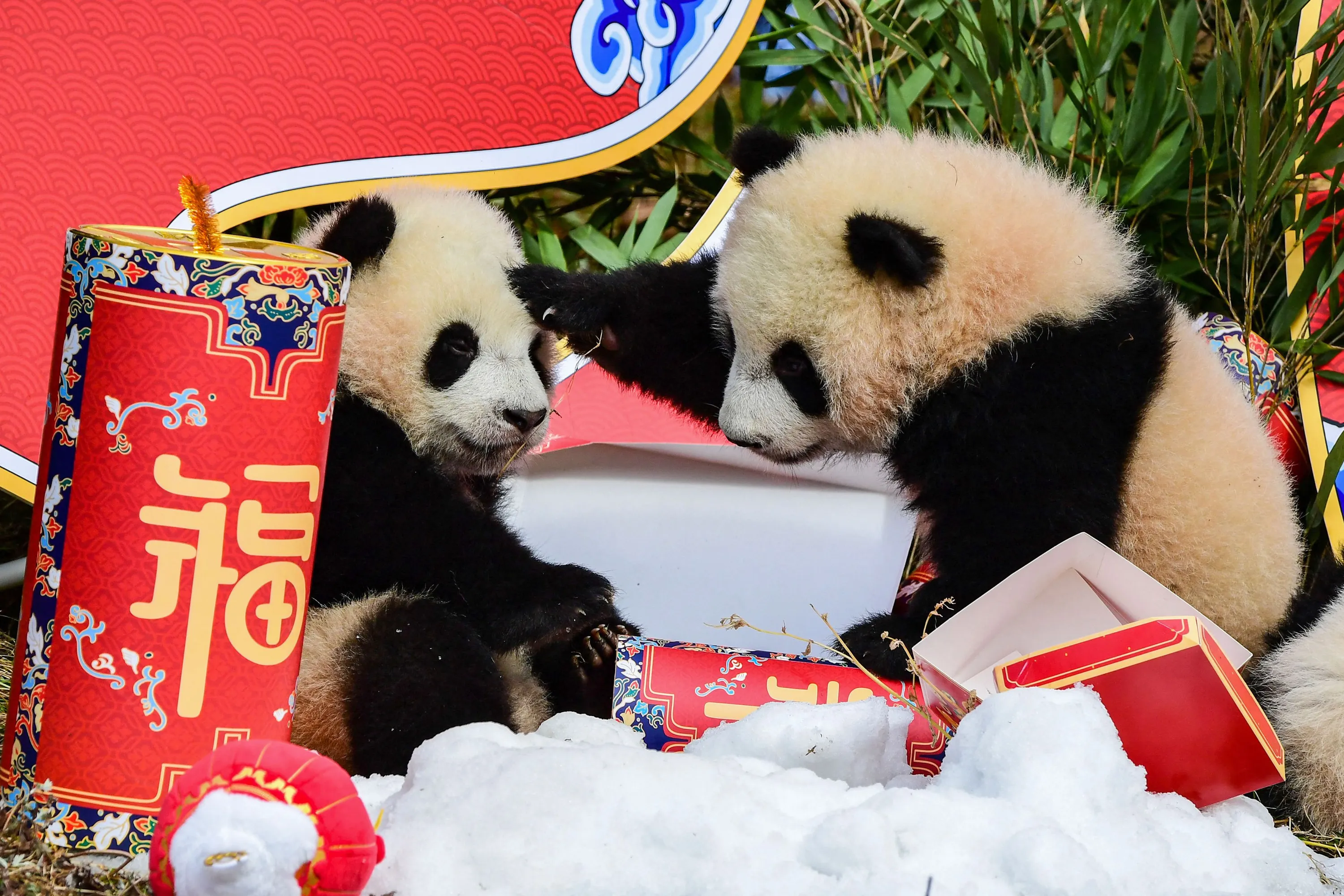 This photo taken on January 24, 2022 shows two panda cubs playing with festive decorations at the Shenshuping breeding base of Wolong National Nature Reserve in Wenchuan, in China's southwestern Sichuan province, ahead of the Lunar New Year of the Tiger on February 1. (Photo by AFP Photo/China Stringer Network)