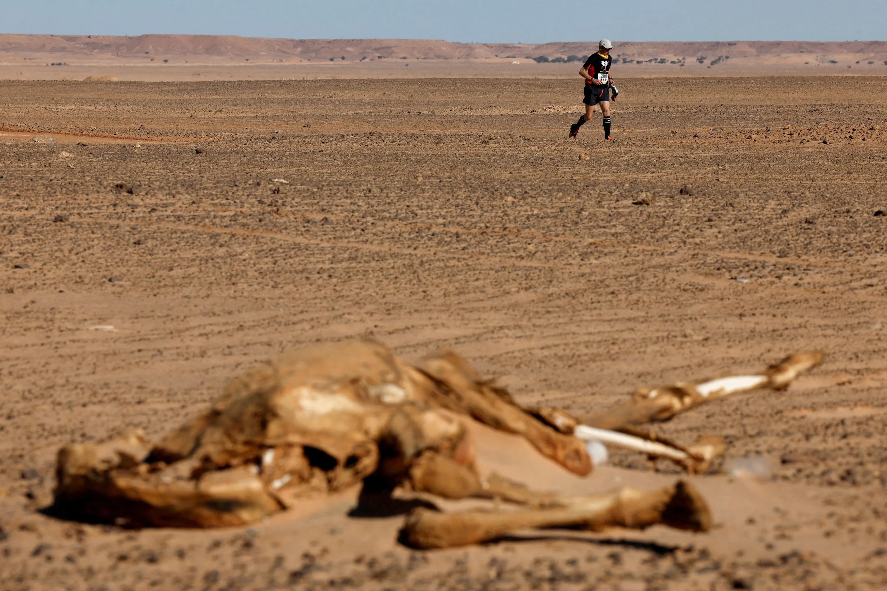 A runner of the XXIII edition of the Sahara Marathon passes near a dead camel, in Tindouf, Algeria on February 28, 2023. (Photo by Borja Suarez/Reuters)