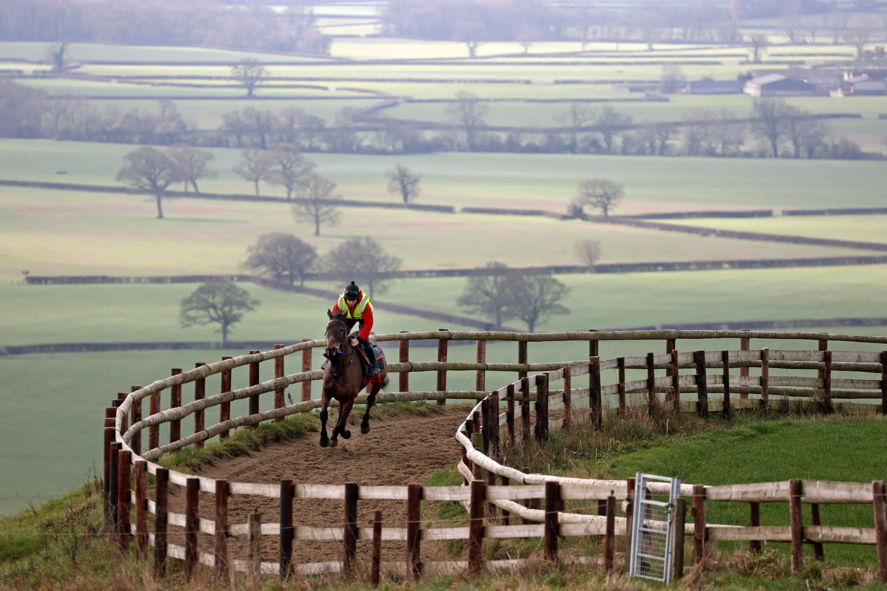 A jockey rides a race horse on the gallops during a press day at trainer Paul Nicholls' Manor Farm stables in Ditcheat near Shepton Mallet, southwest England, on February 27, 2023. (Photo by Adrian Dennis/AFP Photo)