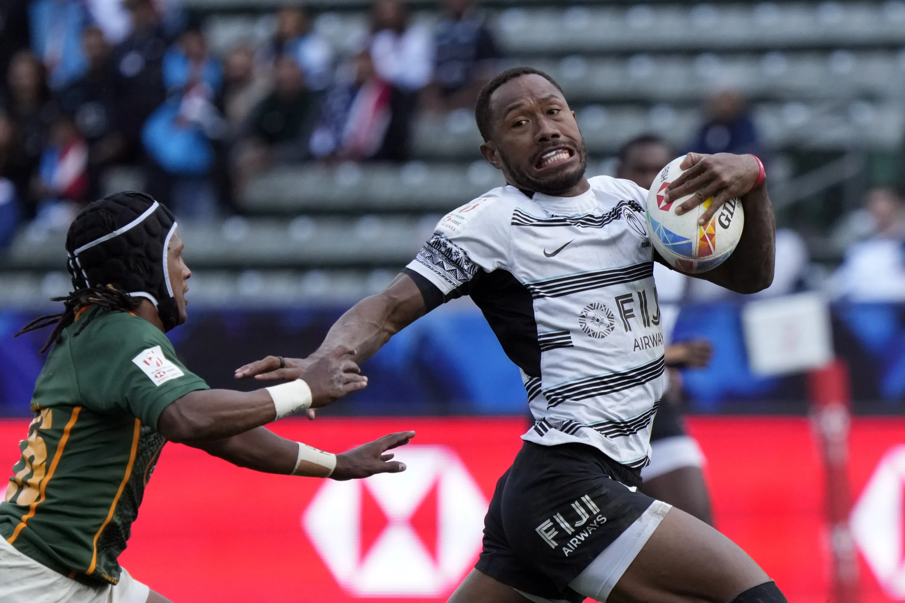 Fiji's Iowane Teba breaks away from South Africa's Jaiden Baron during a World Rugby Sevens Series quarterfinal match in Carson, Calif., Sunday, February 26, 2023. (Photo by Marcio Jose Sanchez/AP Photo)