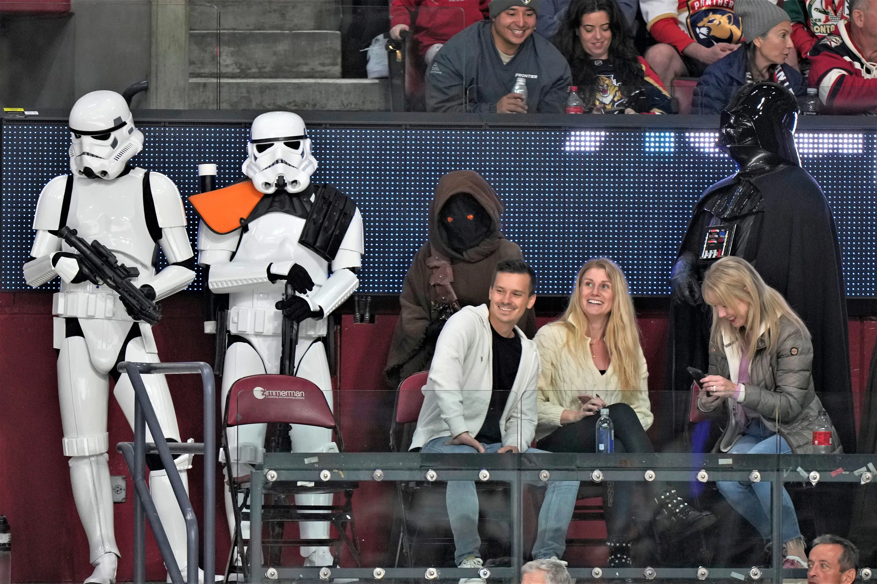 Characters stand near fans during Star Wars Night in the second period of an NHL hockey game between the Florida Panthers and the Nashville Predators, Thursday, March 2, 2023, in Sunrise, Fla.(Photo by Wilfredo Lee/AP Photo)