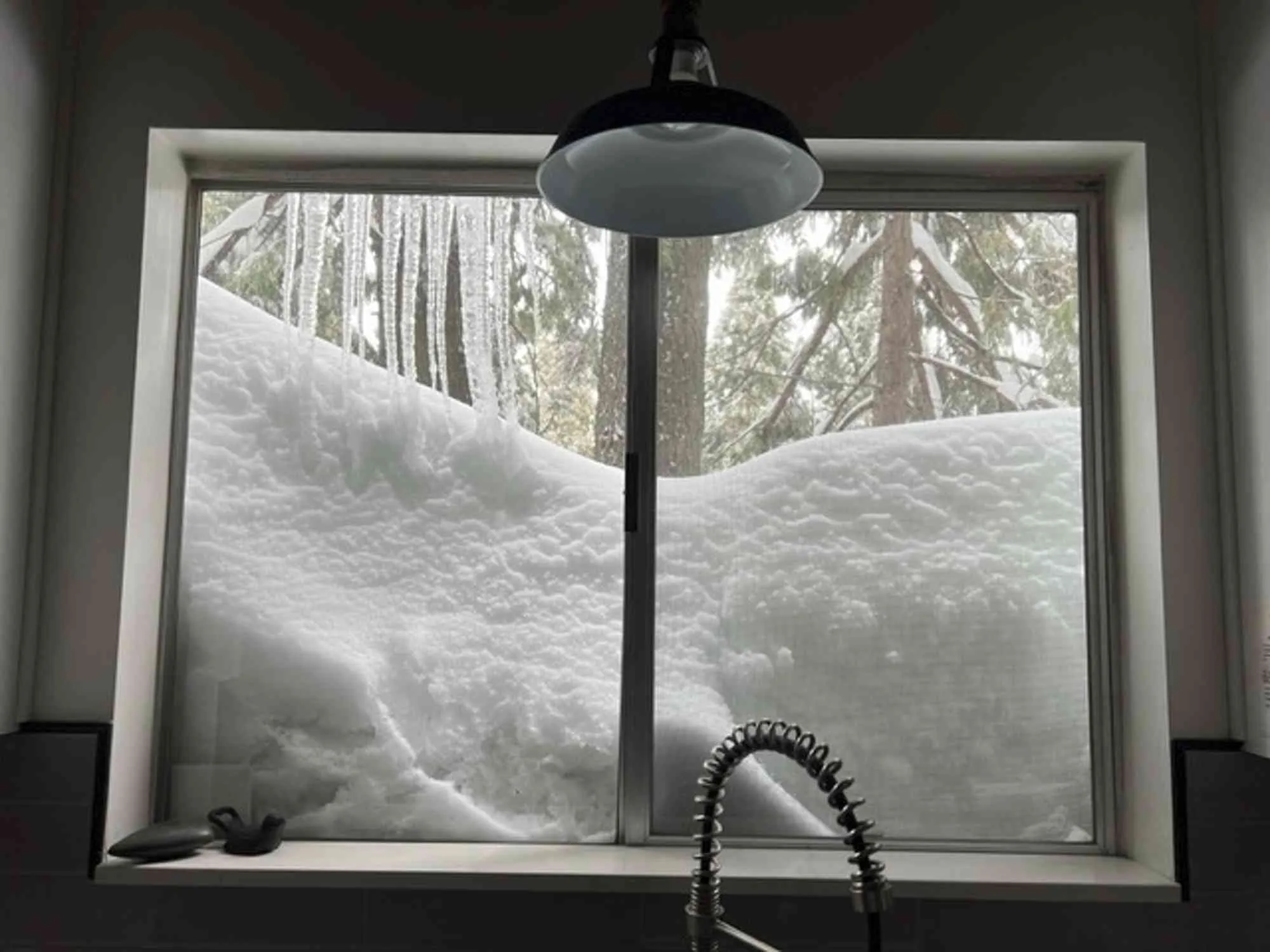 Snow is piled up against the kitchen window of Jennifer Cobb's house in Lake Arrowhead on Tuesday, February 28, 2023 in the San Bernardino Mountains of San Bernardino County, Calif. Beleaguered Californians got hit again Tuesday as a new winter storm moved into the already drenched and snow-plastered state, with blizzard warnings blanketing the Sierra Nevada and forecasters warning residents that any travel was dangerous. (Photo by Jennifer Cobb via AP Photo)