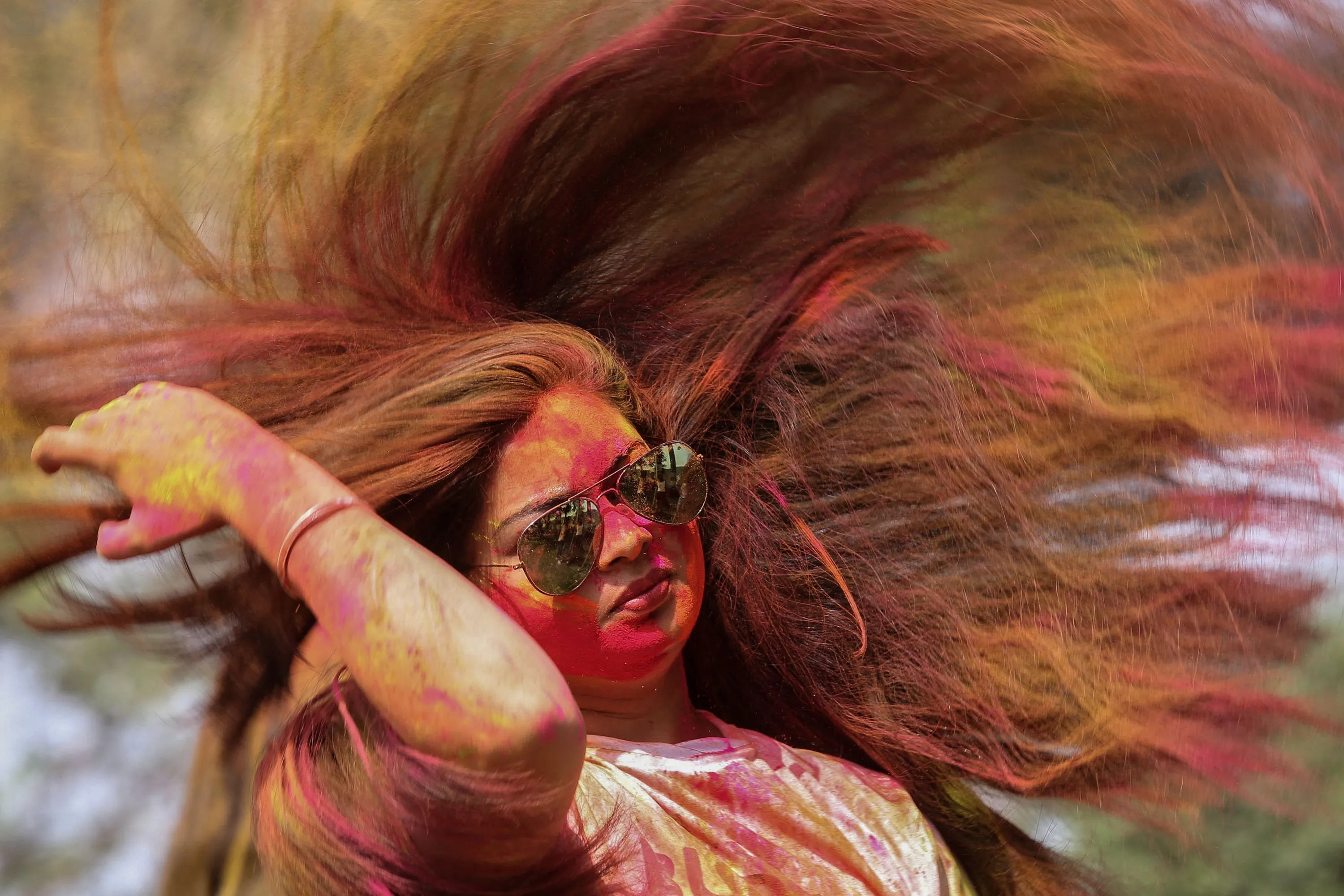 A reveller daubed in “Gulal” or coloured powder celebrates Holi, the Hindu spring festival of colours in Bhopal on March 6, 2023. (Photo by Gagan Nayar/AFP Photo)