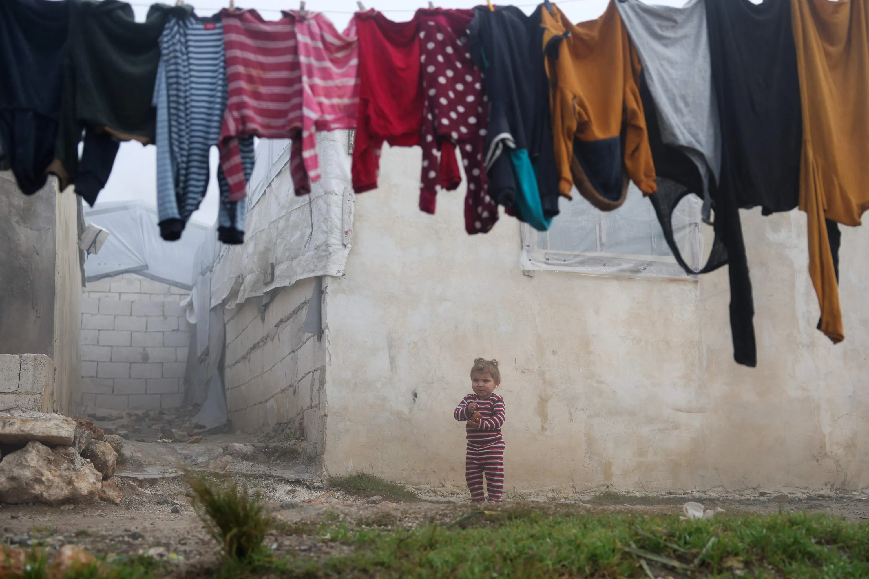 A child plays outdoors on a foggy day at a camp for the internally displaced in the al-Zawf area in the northwestern countryside of Syria's Idlib governorate, near the border with Turkey, on December 17, 2022. (Photo by Omar Haj Kadour/AFP Photo)