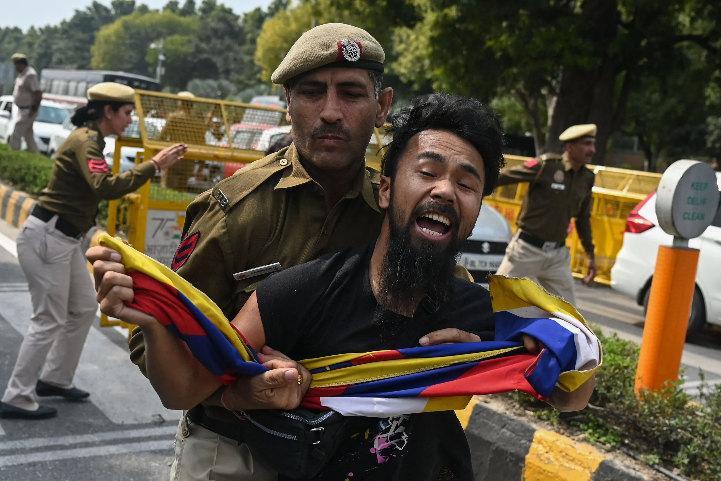An activist of the Tibetan Youth Congress gets detained by security personnel outside the Chinese embassy during a protest against the visit of China's Minister of Foreign Affairs Qin Gang to attend the G20 foreign ministers' meeting, in New Delhi on March 1, 2023. (Photo by Money Sharma/AFP Photo)