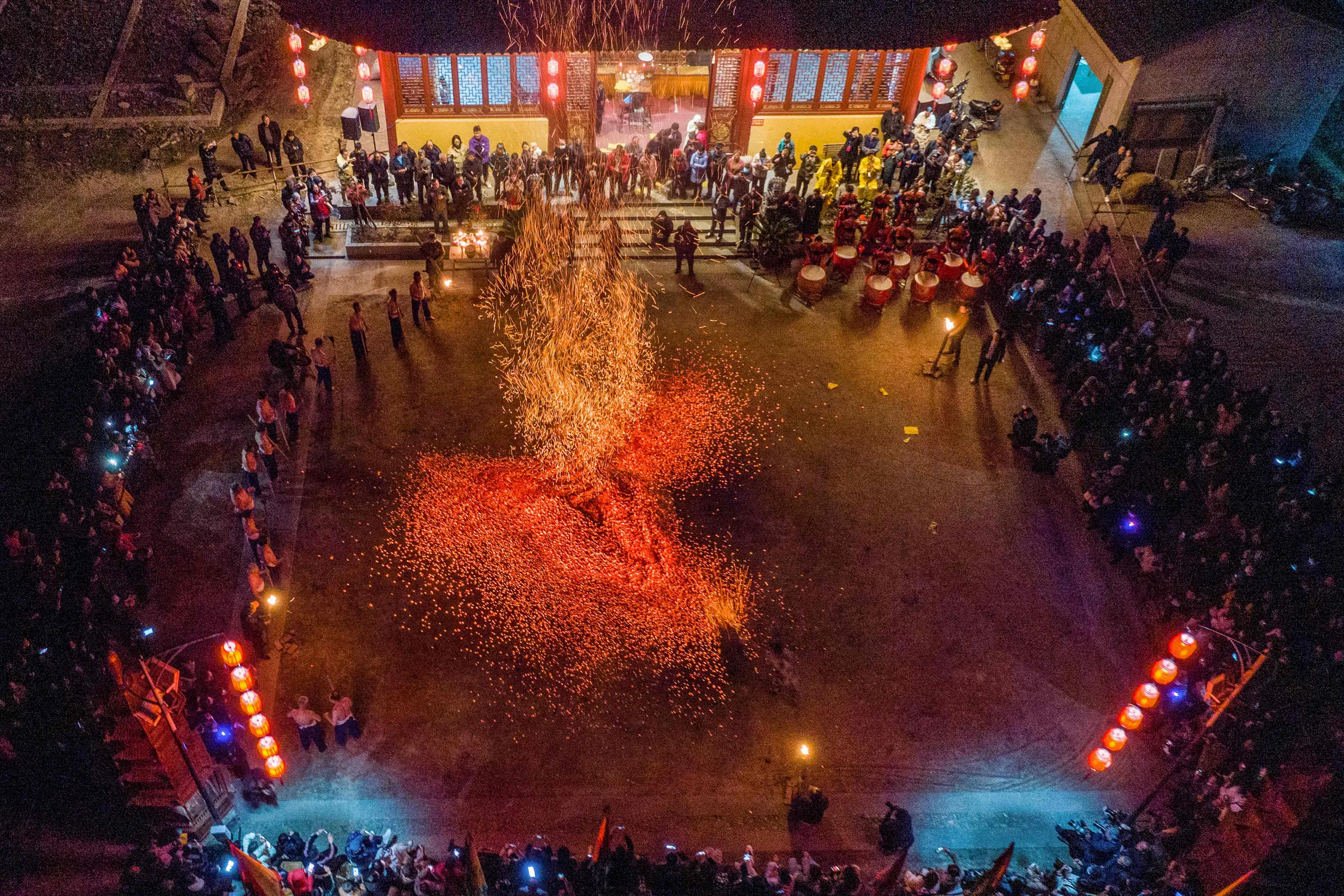 This photo taken on March 1, 2023 shows a man putting on a performce with fire amid a show rooted in ancient traditions to ward off bad luck and to bring along good fortune in Pan'An County, Jinhua city, in China's eastern Zhejiang province. (Photo by AFP Photo/China Stringer Network)